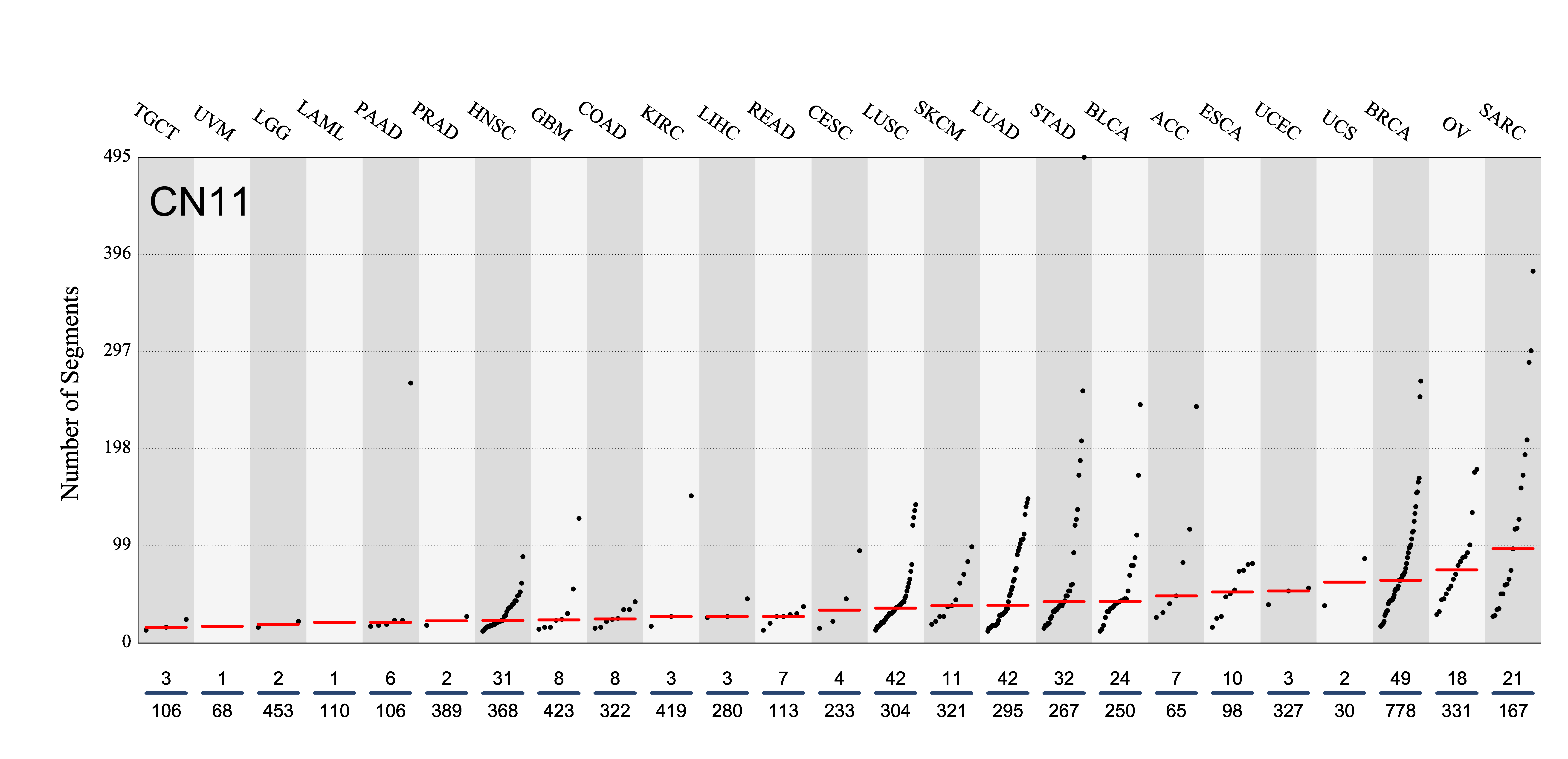 Additionally, CN11 is positively associated with scarHRD scores, a measure of homologous recombination deficiency (see Sztupinszki et al., 2018), and associated with a reduced leucocyte fraction in stomach adenocarcinoma (see Thorsson et al., 2018).