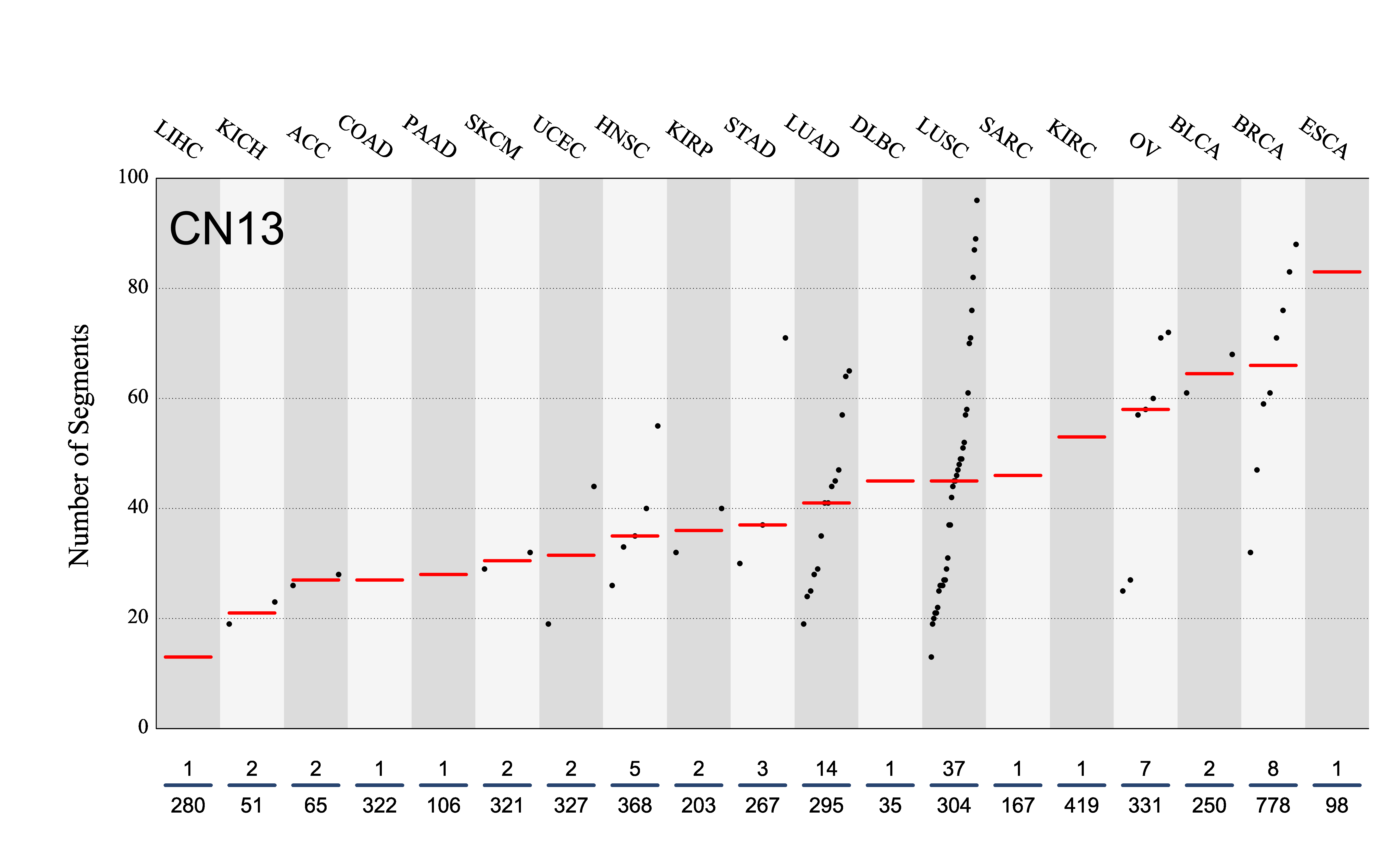 CN13 is also associated with increased hypoxia scores (see Eustace et al., 2013 & Yang et al., 2018), and with increased leucocyte fraction in lung squamous cell carcinoma (see Thorsson et al., 2018).