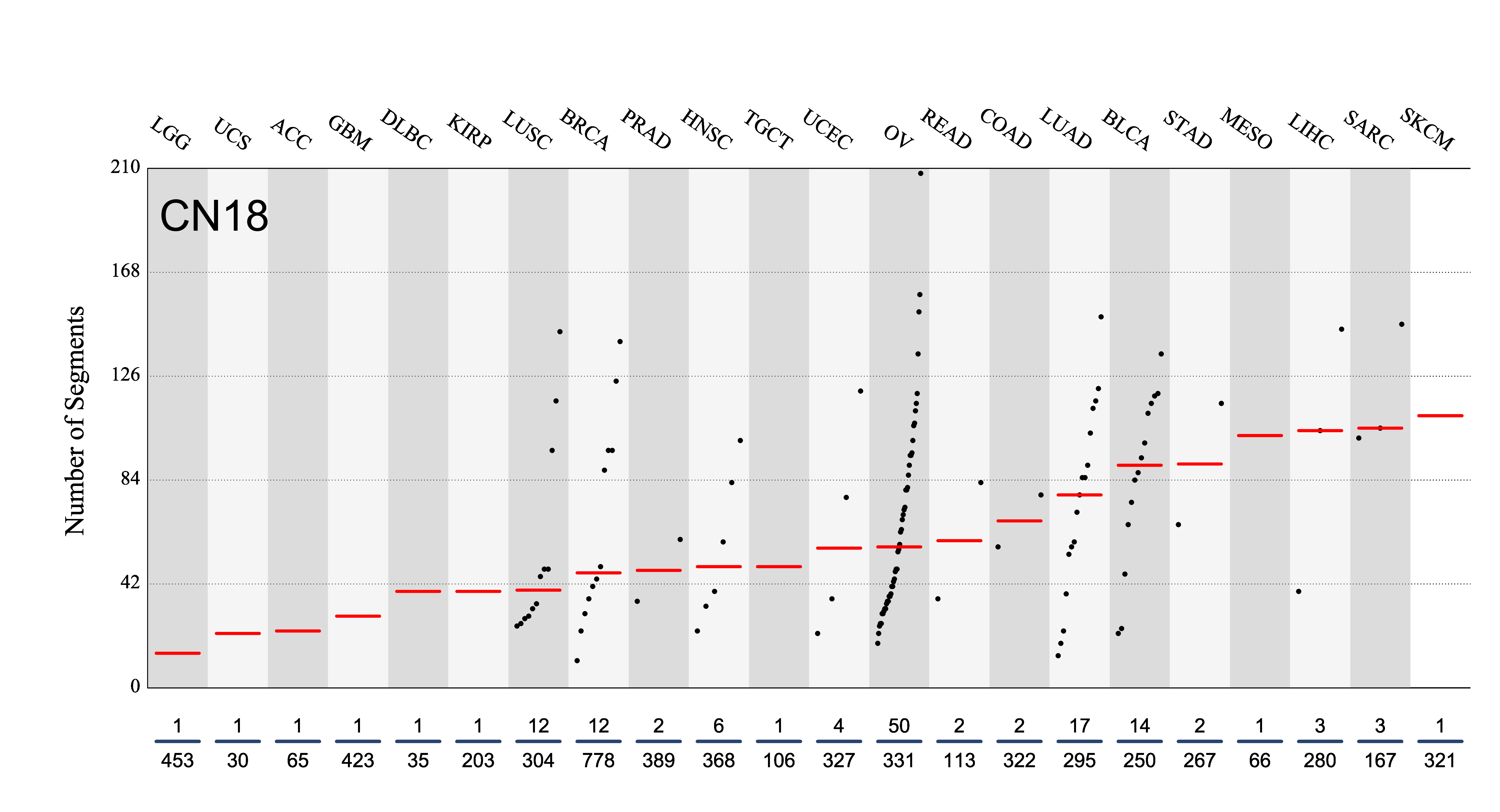 CN18 is a signature with unknown aetiology. However, this signature positively associates with scarHRD scores (a measure of genomic scars of homologous recombination deficiency, see Sztupinszki et al., 2018), and with hypoxia scores (see Eustace et al., 2013 & Yang et al., 2018). In addition, CN18 is associated with twice-genome-doubled samples, and was observed in simulations of CIN with two genome doubling events. Lastly CN18 associates with TP53 mutation in breast cancer.