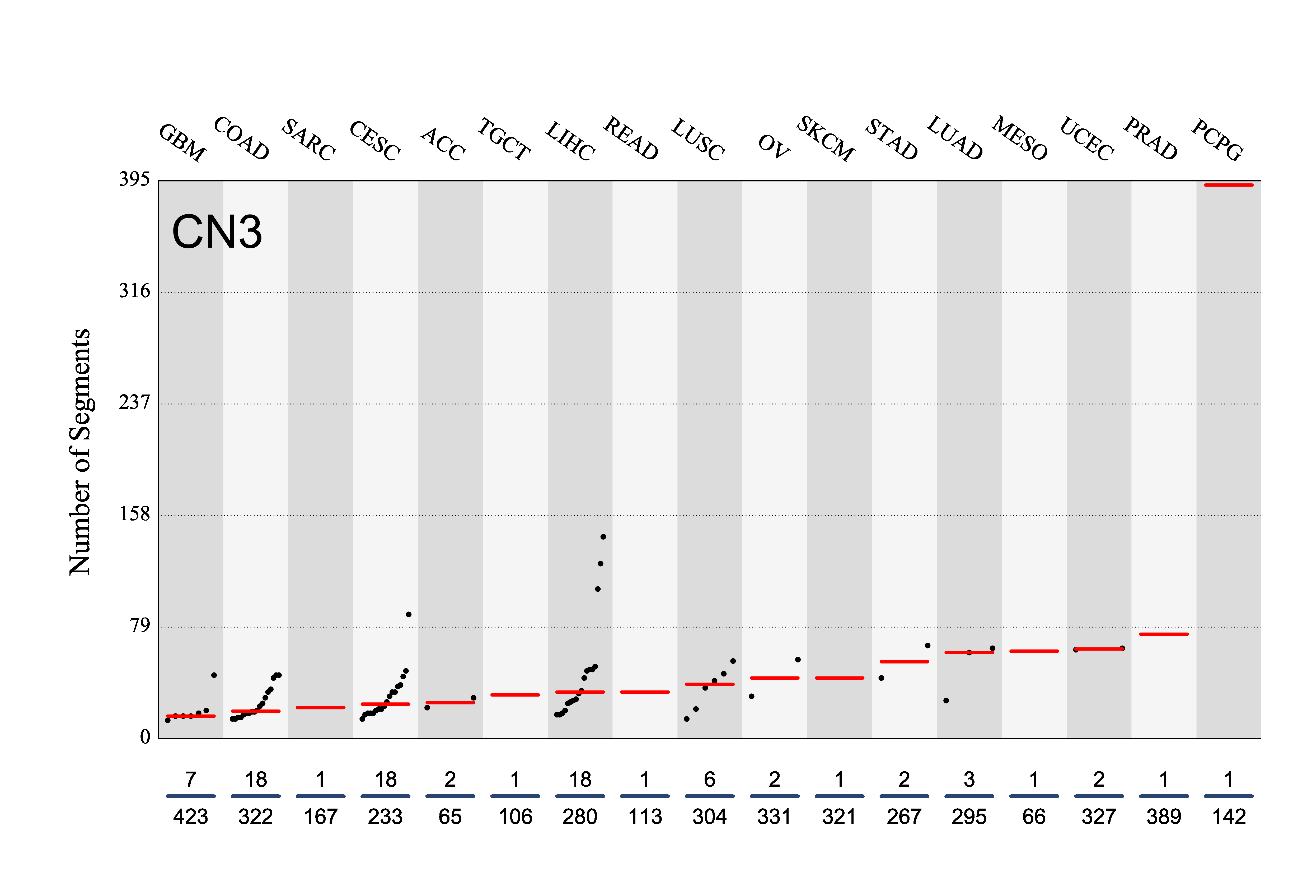 CN3 is primarily a signature of an octoploid genome, however this signature has more varied segment sizes than CN1 or CN2 which may indicate a greater effect of chromosomal instability on a octoploid genome. This has been verified through simulations of twice genome doubling combined with strong chromosomal instability, and associations with twice-genome-doubled samples. Note that due to the copy number class that most strongly defines this signature (TCN 5-8), a cancer that is anywhere from pentaploid to octoploid may be assigned this signature.