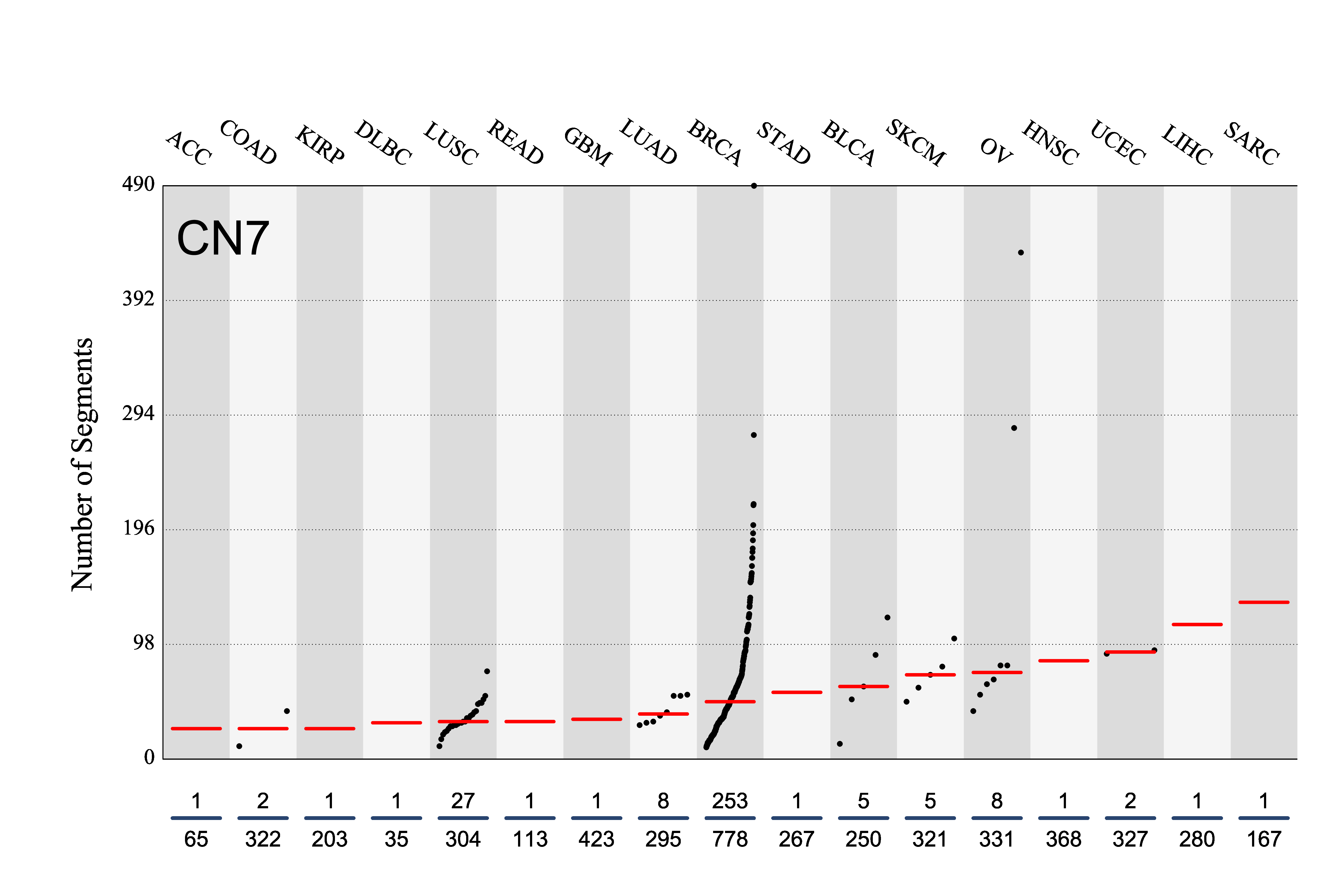 CN7 is positively associated with BFB, chromoplexy, and tyfonas rearrangement classes (see Hadi et al., 2020) and with poor disease specific survival for patients in combination with other chromothripsis/amplicon signatures.