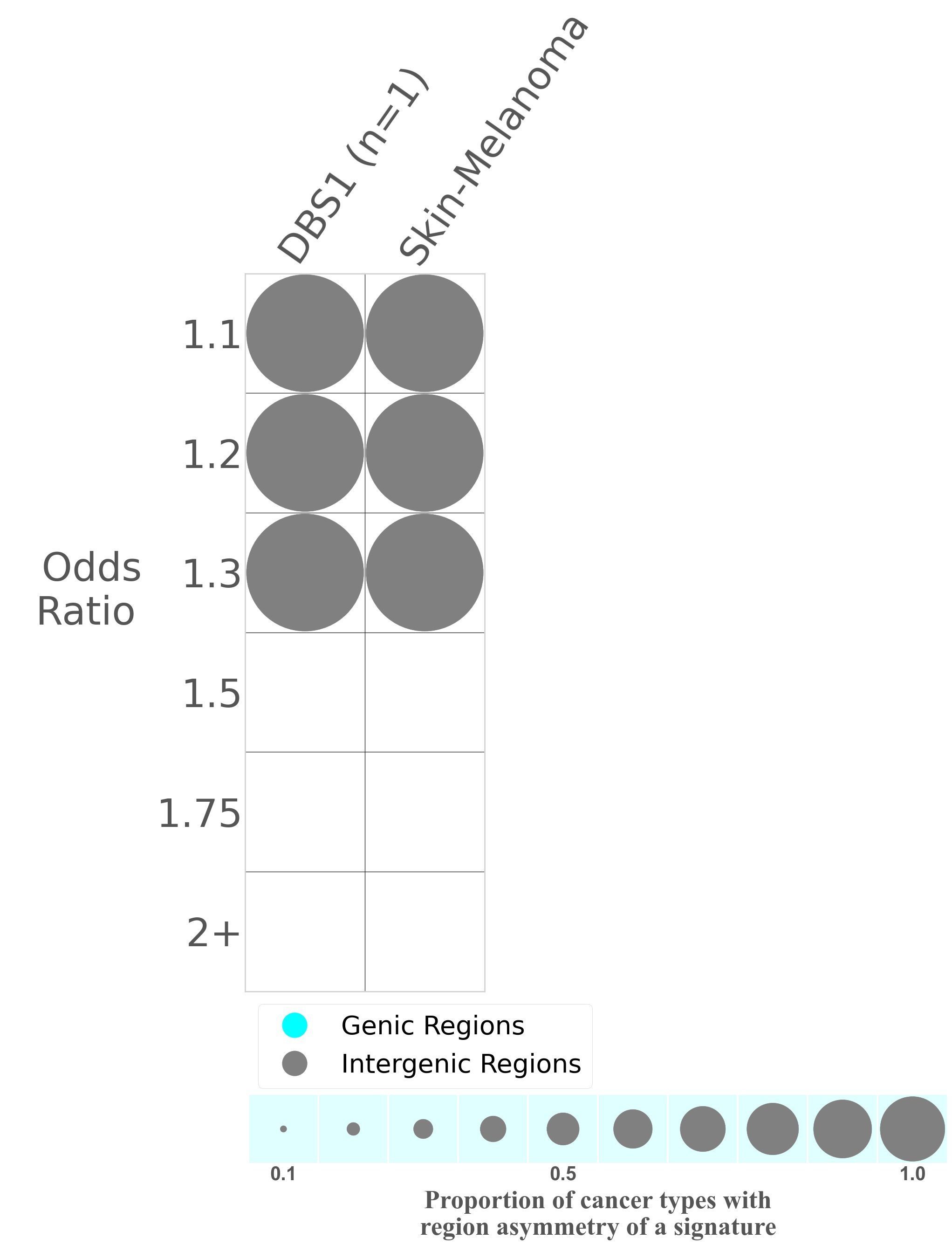 In the lower circle plot, the circles are filled with the colour of the significant region when there is an odds ratio of at least 1.1 with statistical significance. The first row of this plot displays the genic versus intergenic region asymmetry across all cancer types, while the remaining rows present genic versus intergenic region asymmetry for each cancer type.