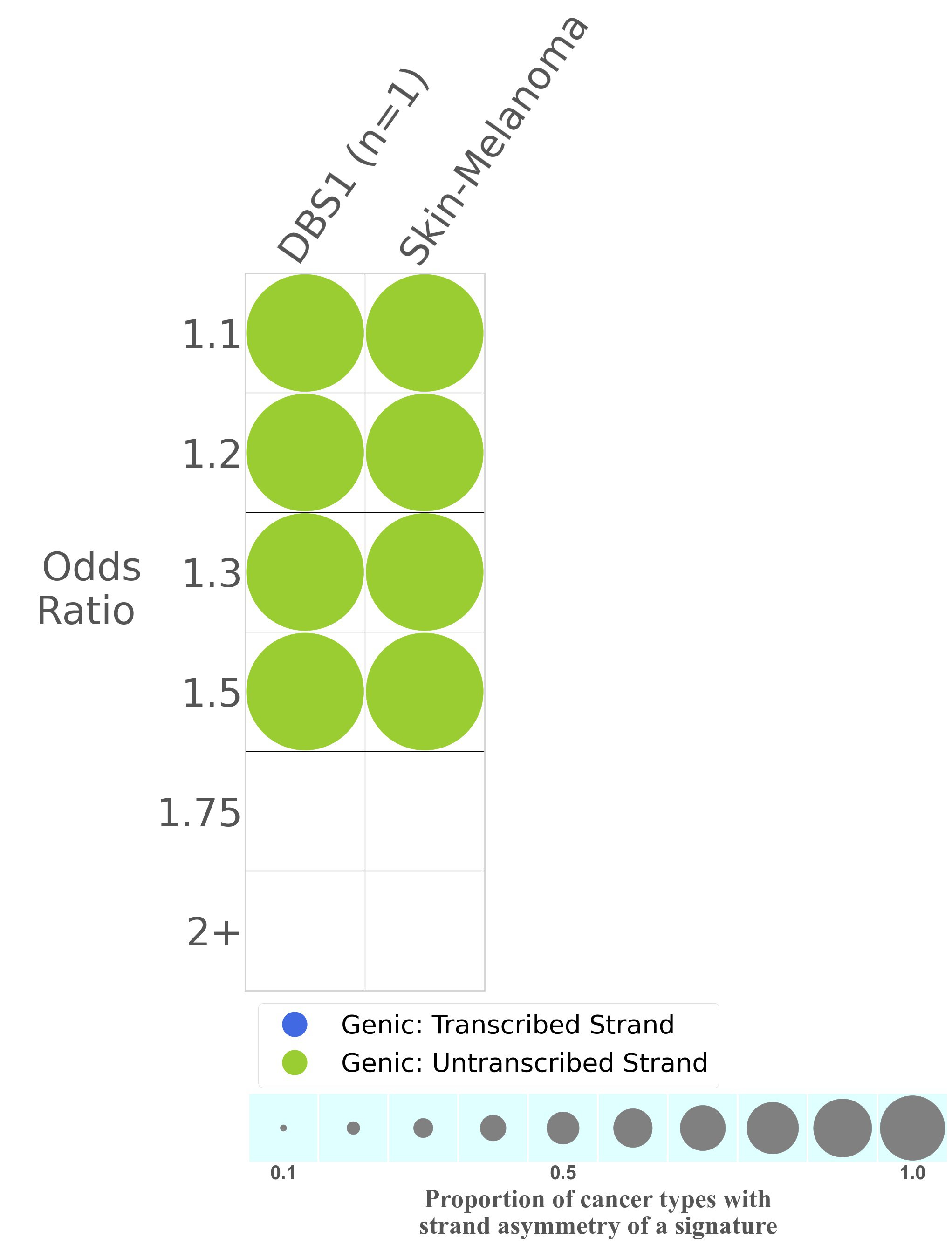 In the lower circle plot, the circles are filled with the colour of the significant strand when there is an odds ratio of at least 1.1 with statistical significance. The first row of this plot displays the transcriptional strand asymmetry across all cancer types, while the remaining rows present transcriptional strand asymmetry for each cancer type.