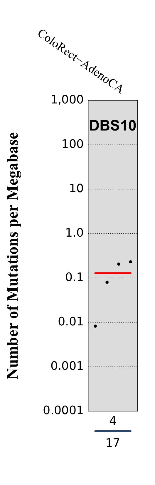 DBS10 mutations are present in high numbers in most samples in which it has been observed. DBS10 is associated with some of the single base substitution mutational signatures present in DNA mismatch repair deficient cancers SBS6, SBS14, SBS15, SBS20, SBS21, SBS26, and SBS44, and with large numbers of ID1 and ID2 mutations.