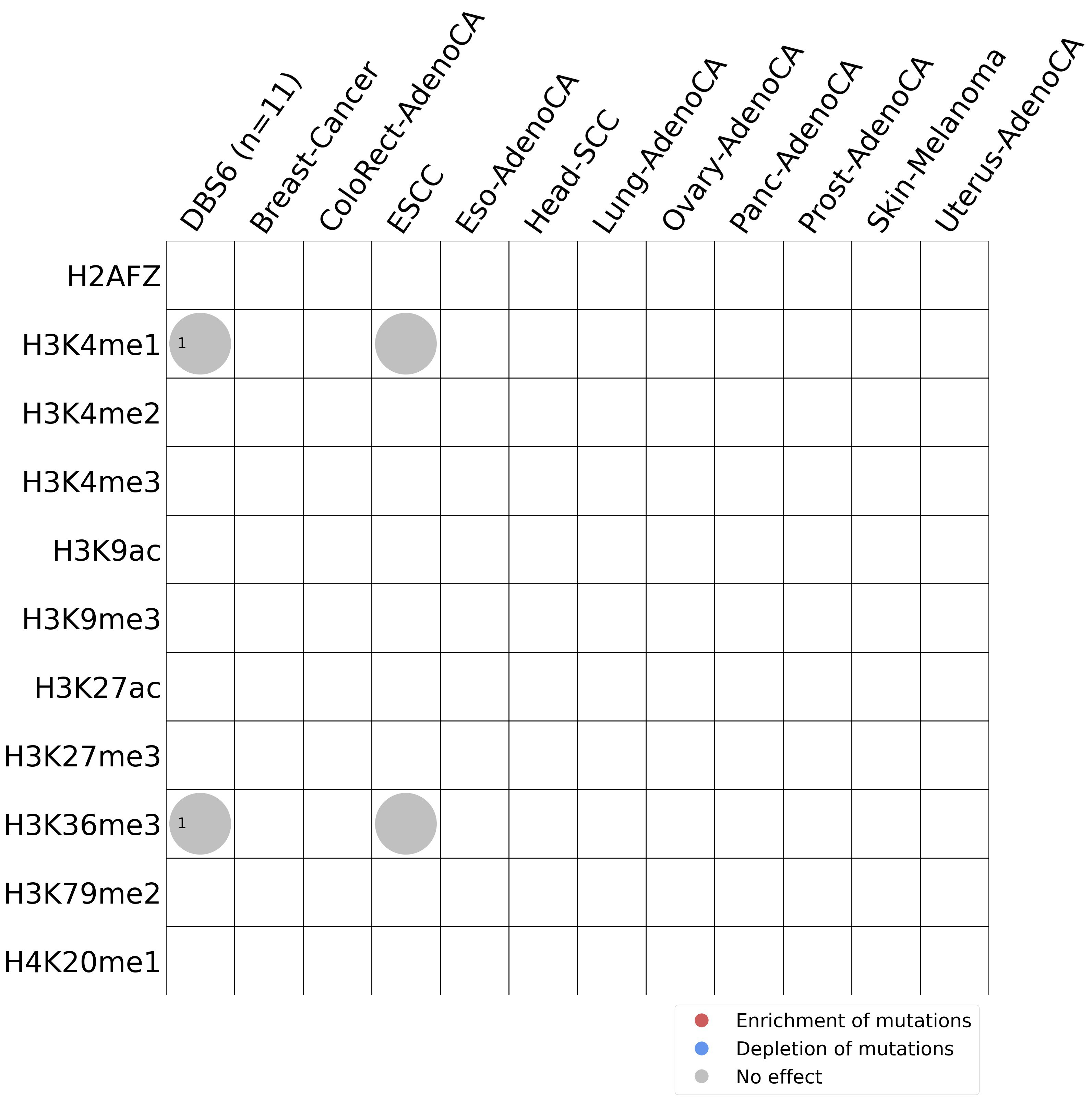 This plot shows the associations between mutational signatures and histone marks. Pie charts display the number of cancer types that are either enriched, depleted, or have no statistical effect for a given mutational signature and a specific histone mark. Differential changes are calculated by statistically comparing the of average signals between real and simulated mutations using a 100 base window centered at the somatic mutation. Enrichments reflect at least 5% statistically significant increases in real signal when compared to simulated signal. Depletions reflect at least 5% statistically significant decreases in real signal when compared to simulated signal. Statistical significance is determined based on false-discovery rate corrected p-value below 0.05.