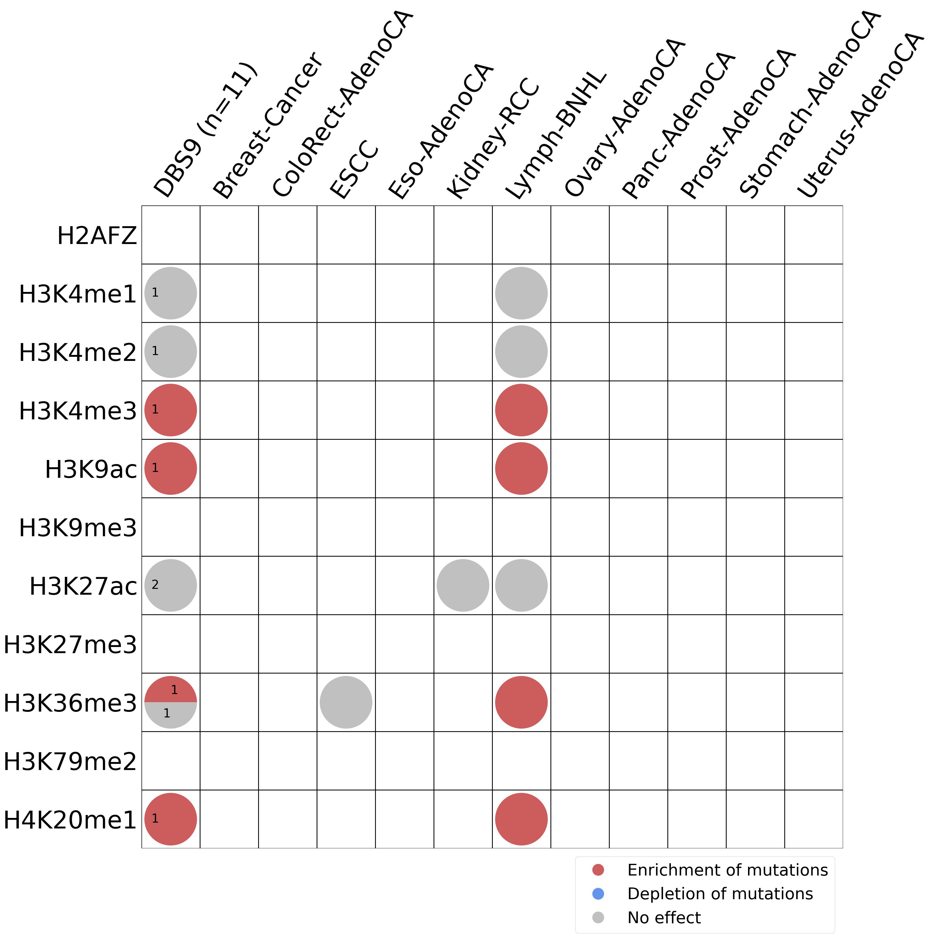 This plot shows the associations between mutational signatures and histone marks. Pie charts display the number of cancer types that are either enriched, depleted, or have no statistical effect for a given mutational signature and a specific histone mark. Differential changes are calculated by statistically comparing the of average signals between real and simulated mutations using a 100 base window centered at the somatic mutation. Enrichments reflect at least 5% statistically significant increases in real signal when compared to simulated signal. Depletions reflect at least 5% statistically significant decreases in real signal when compared to simulated signal. Statistical significance is determined based on false-discovery rate corrected p-value below 0.05.