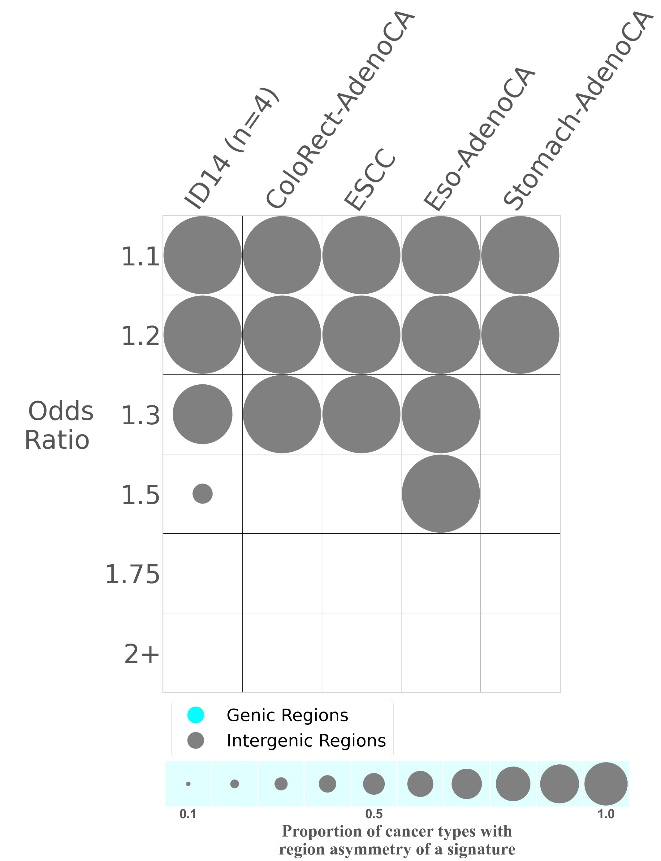 In the lower circle plot, the circles are filled with the colour of the significant region when there is an odds ratio of at least 1.1 with statistical significance. The first row of this plot displays the genic versus intergenic region asymmetry across all cancer types, while the remaining rows present genic versus intergenic region asymmetry for each cancer type.