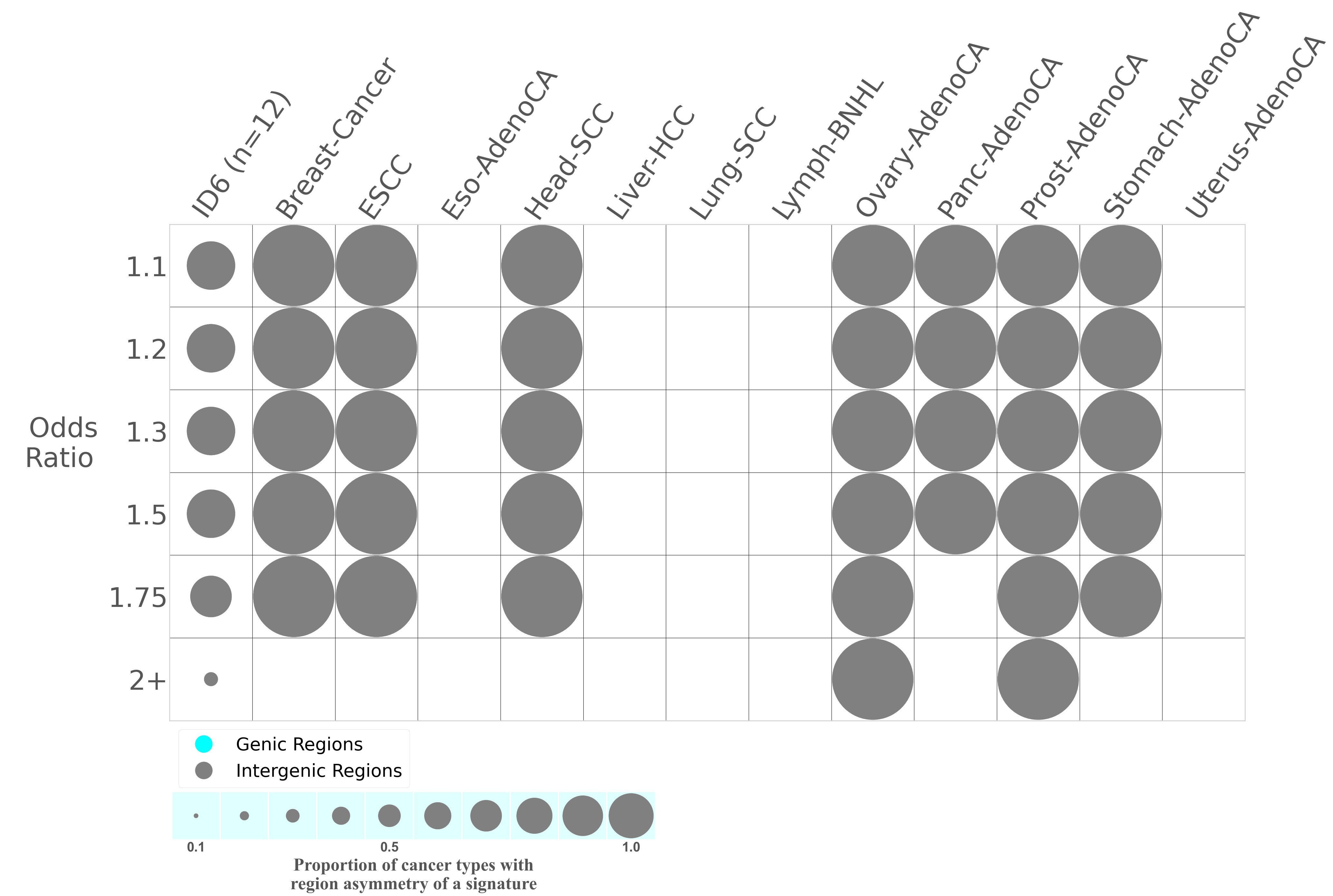 In the lower circle plot, the circles are filled with the colour of the significant region when there is an odds ratio of at least 1.1 with statistical significance. The first row of this plot displays the genic versus intergenic region asymmetry across all cancer types, while the remaining rows present genic versus intergenic region asymmetry for each cancer type.