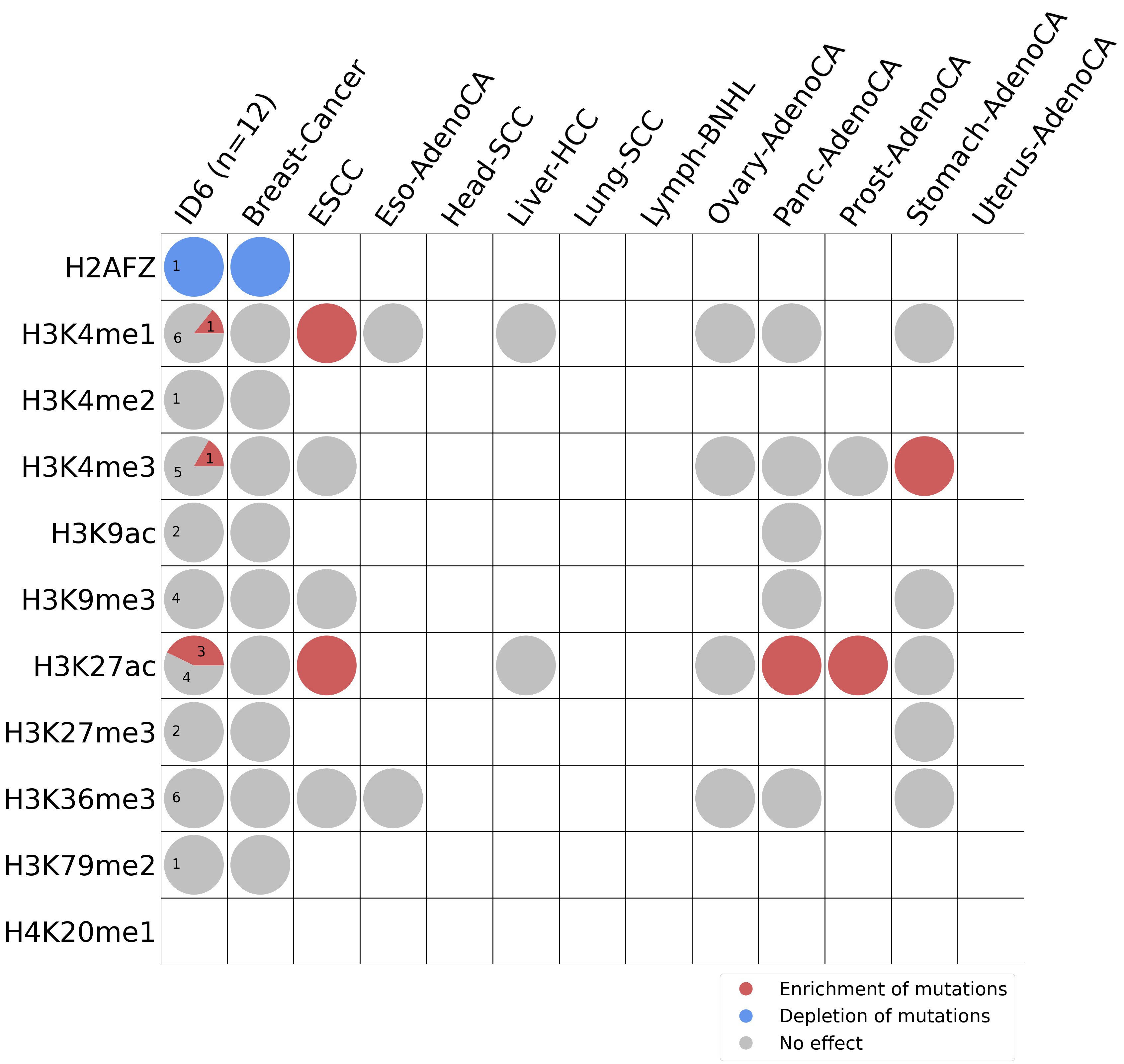 This plot shows the associations between mutational signatures and histone marks. Pie charts display the number of cancer types that are either enriched, depleted, or have no statistical effect for a given mutational signature and a specific histone mark. Differential changes are calculated by statistically comparing the of average signals between real and simulated mutations using a 100 base window centered at the somatic mutation. Enrichments reflect at least 5% statistically significant increases in real signal when compared to simulated signal. Depletions reflect at least 5% statistically significant decreases in real signal when compared to simulated signal. Statistical significance is determined based on false-discovery rate corrected p-value below 0.05.