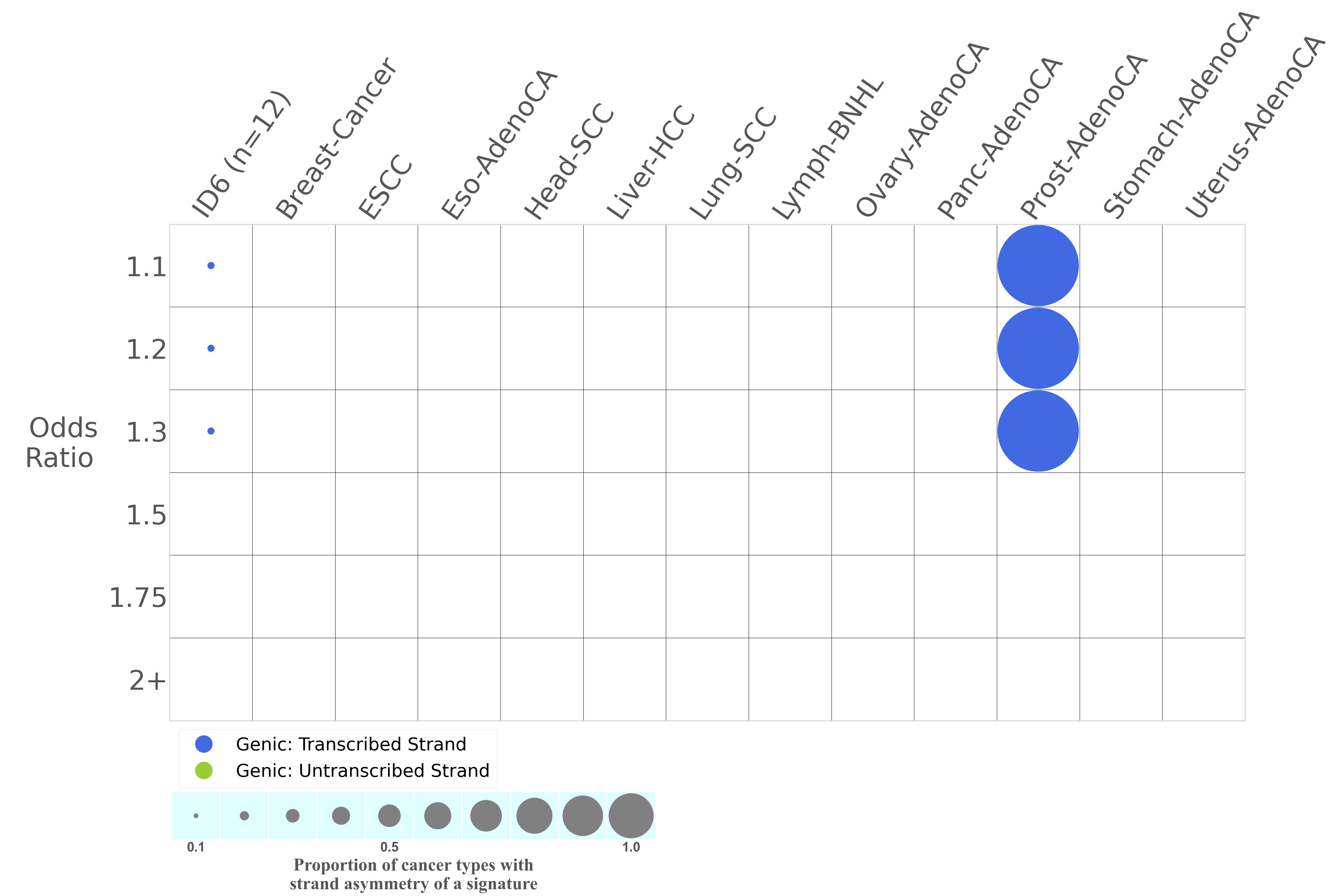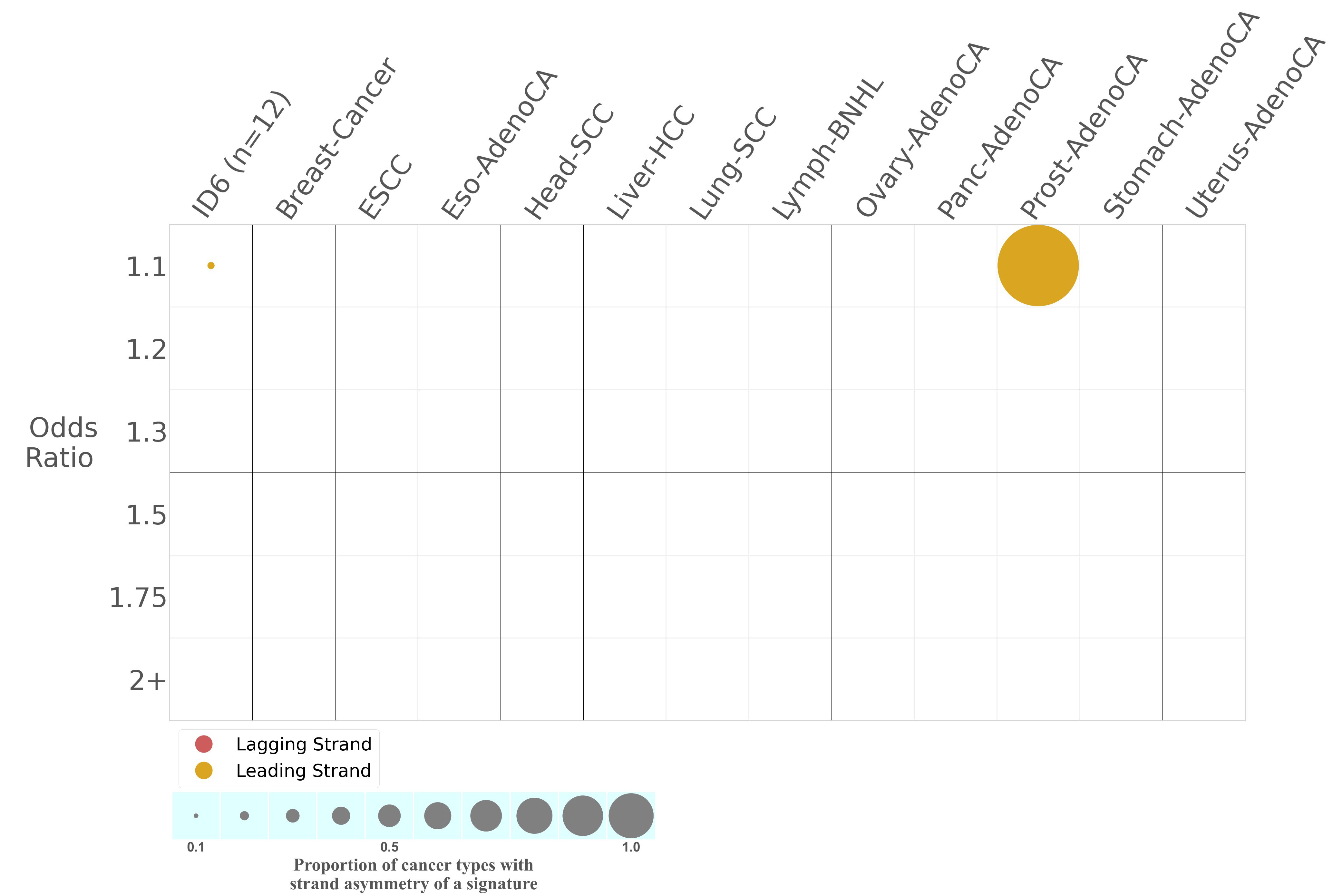 In the lower circle plot, the circles are filled with the colour of the significant strand when there is an odds ratio of at least 1.1 with statistical significance. The first row of this plot displays the replicational strand asymmetry across all cancer types, while the remaining rows present replicational strand asymmetry for each cancer type.