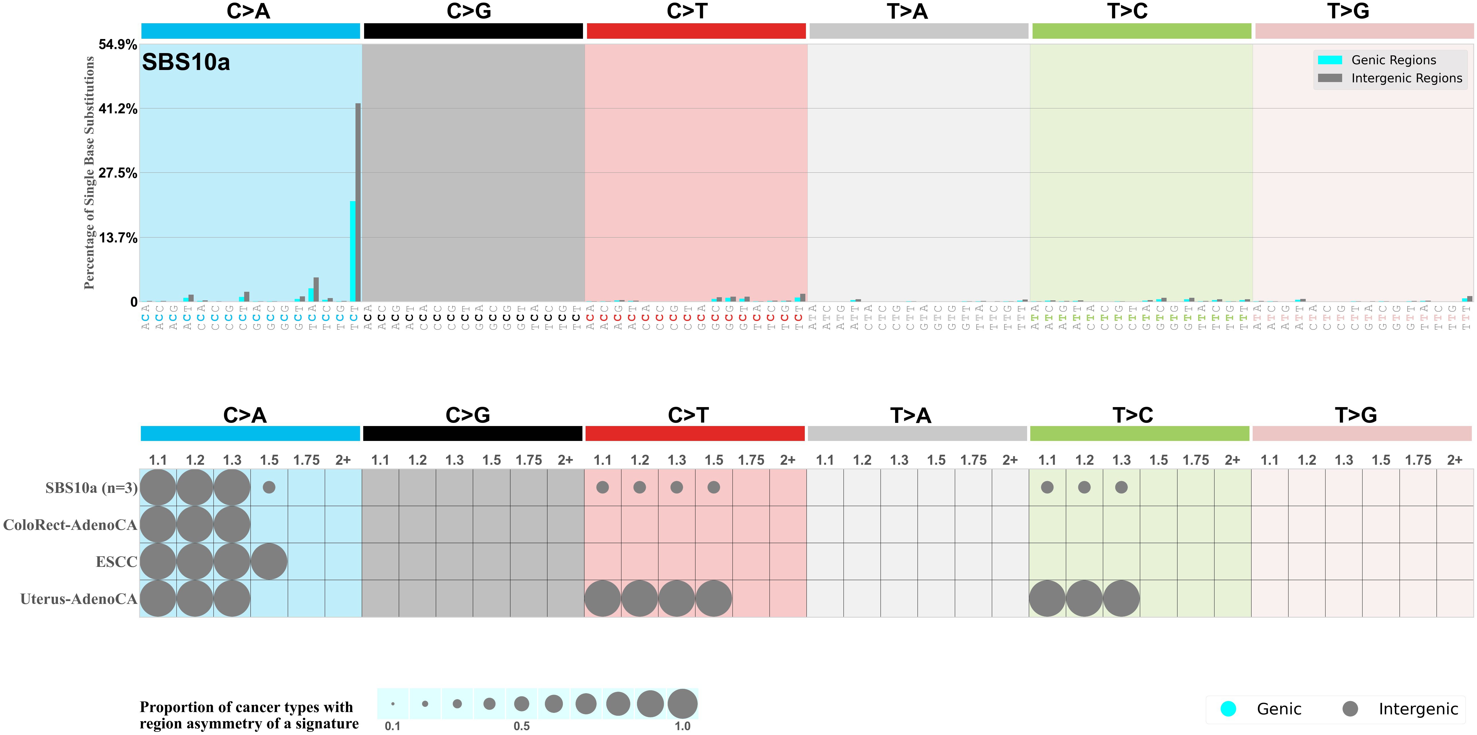 In the lower circle plot, the circles are filled with the colour of the significant region when there is an odds ratio of at least 1.1 with statistical significance. The first row of this plot displays the genic versus intergenic region asymmetry across all cancer types, while the remaining rows present genic versus intergenic region asymmetry for each cancer type.