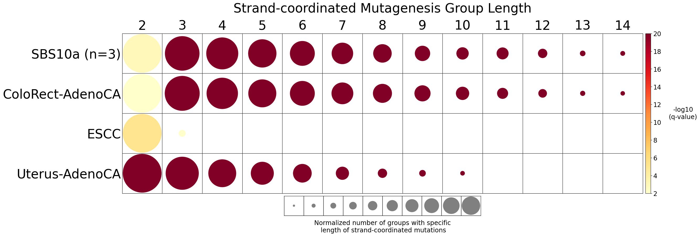 Strand-coordinated mutagenesis analysis identifies groups of consecutive single-base substitutions on the same DNA strand with the same pyrimidine mutation context (e.g., consecutive C>A, C>A, C>A) attributed to the same mutational signature within a sample.