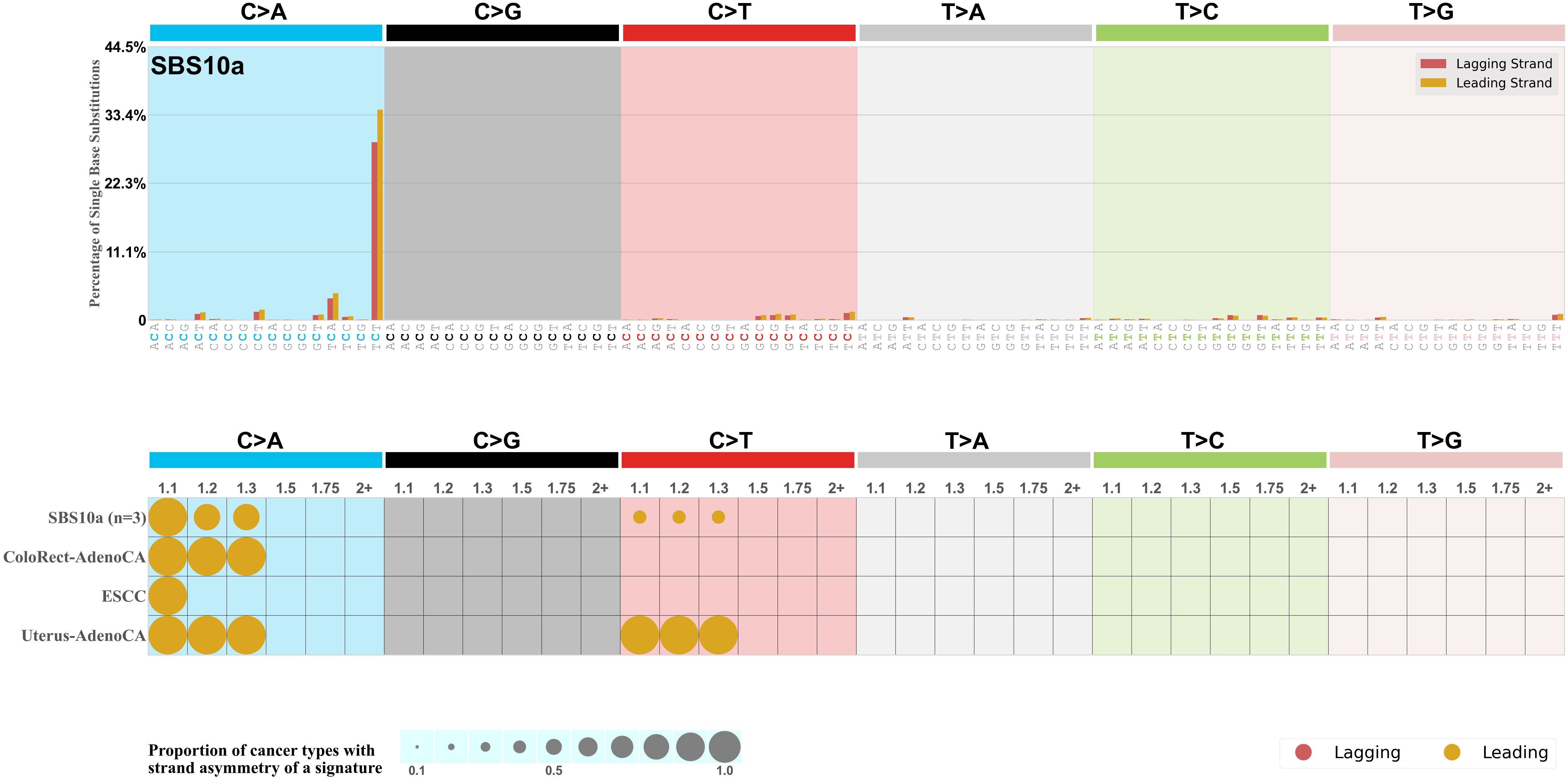 Each mutation attributed to the mutational signature is annotated as either on the lagging strand or the leading strand.