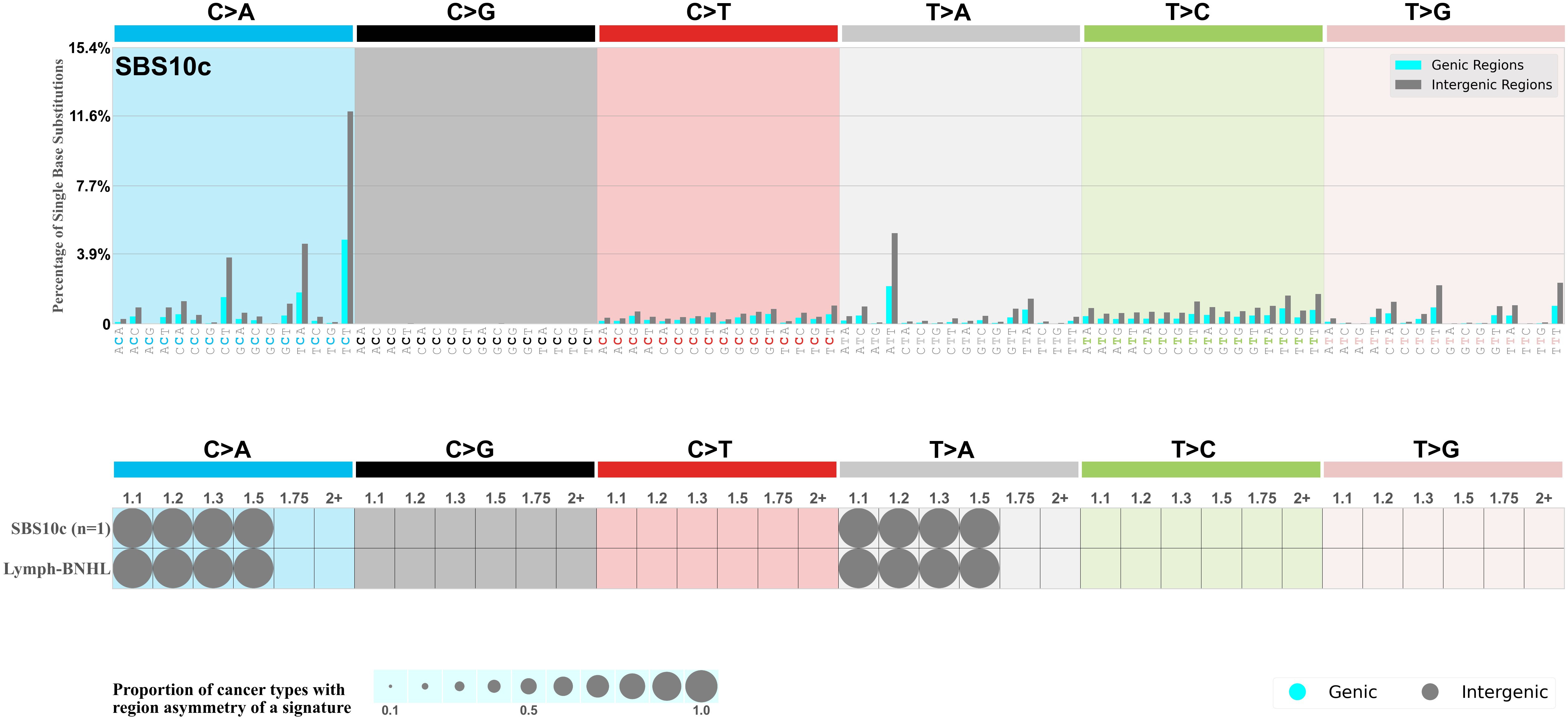 In the lower circle plot, the circles are filled with the colour of the significant region when there is an odds ratio of at least 1.1 with statistical significance. The first row of this plot displays the genic versus intergenic region asymmetry across all cancer types, while the remaining rows present genic versus intergenic region asymmetry for each cancer type.