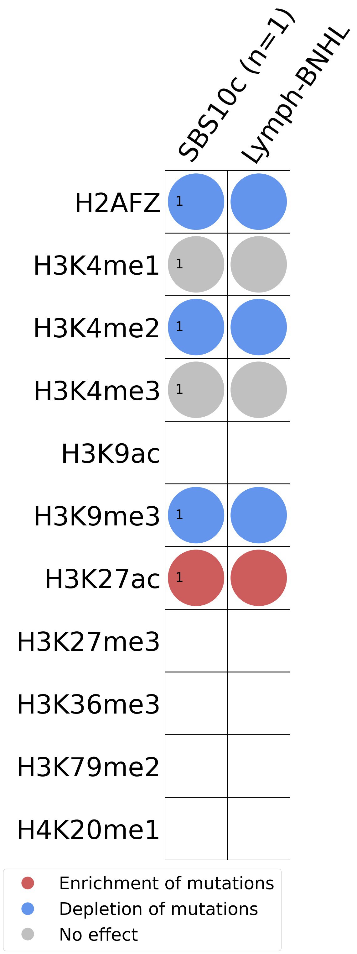 (i) H2AFZ, a replication-independent member of the histone H2A family that renders chromatin accessible at enhancers and promoters and regulates transcriptional activation and repression; (ii) H3K4me1, histone mark often associated with enhancer activity; (iii) H3K4me2, a histone post-translational modification enriched in cis-regulatory regions, including both enhancers and promoters; (iv) H3K4me3, post-translational modification enriched in active promoters near transcription start sites; (v) H3K9ac, associated with active gene promoters and active transcription; (vi) H3K9me3, typical mark of constitutive heterochromatin; (vii) H3K27ac, histone modification generally contained at nucleosomes flanking enhancers; (viii) H3K27me3, repressive, associated with silent genes; (ix) H3K36me3, associated with transcribed regions and playing a role in regulating DNA damage repair; (x) H3K79me2, detected in the transcribed regions of active genes; and (xi) H4K20me1, found in gene promoters and associated with gene transcriptional elongation and transcription activation.