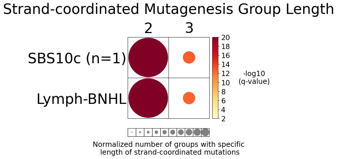 Strand-coordinated mutagenesis analysis identifies groups of consecutive single-base substitutions on the same DNA strand with the same pyrimidine mutation context (e.g., consecutive C>A, C>A, C>A) attributed to the same mutational signature within a sample.