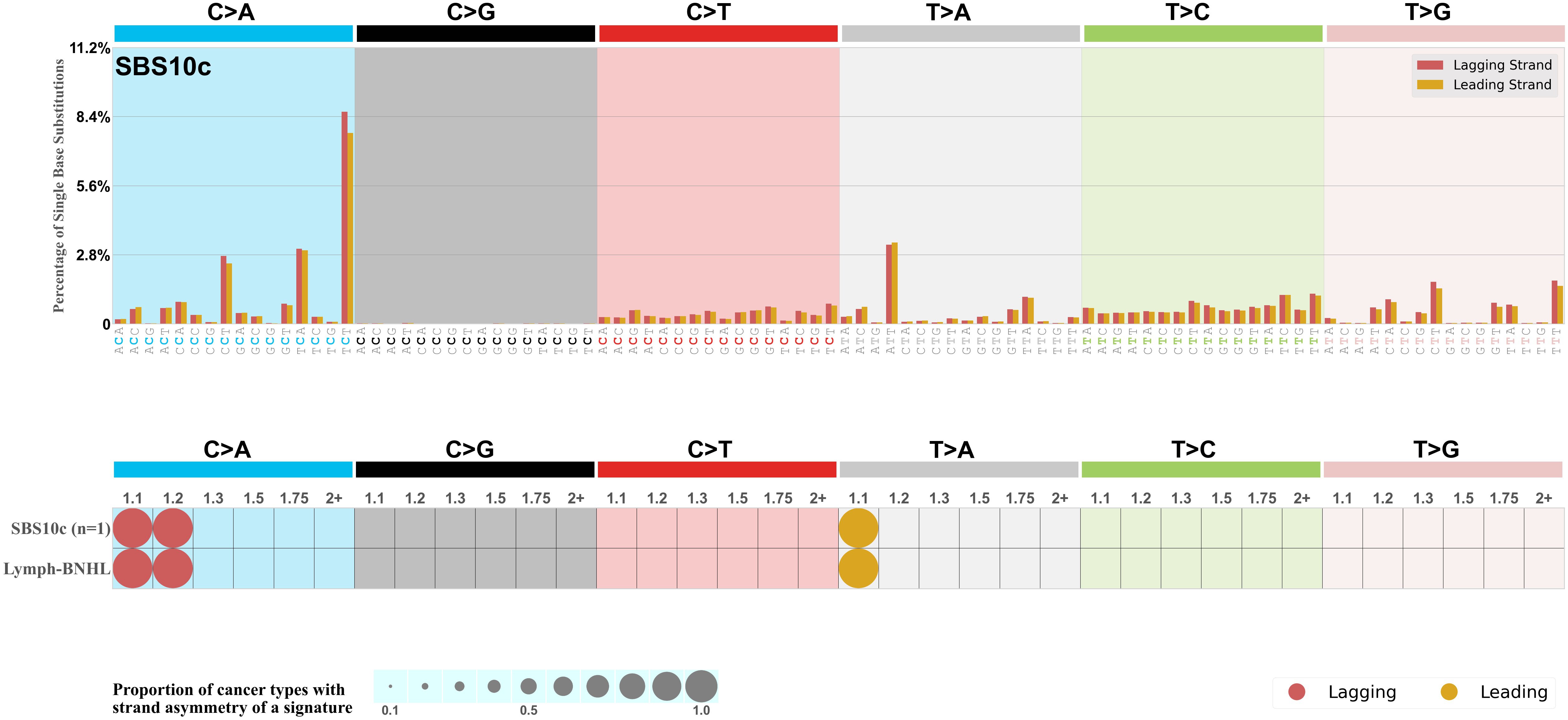 Each mutation attributed to the mutational signature is annotated as either on the lagging strand or the leading strand.