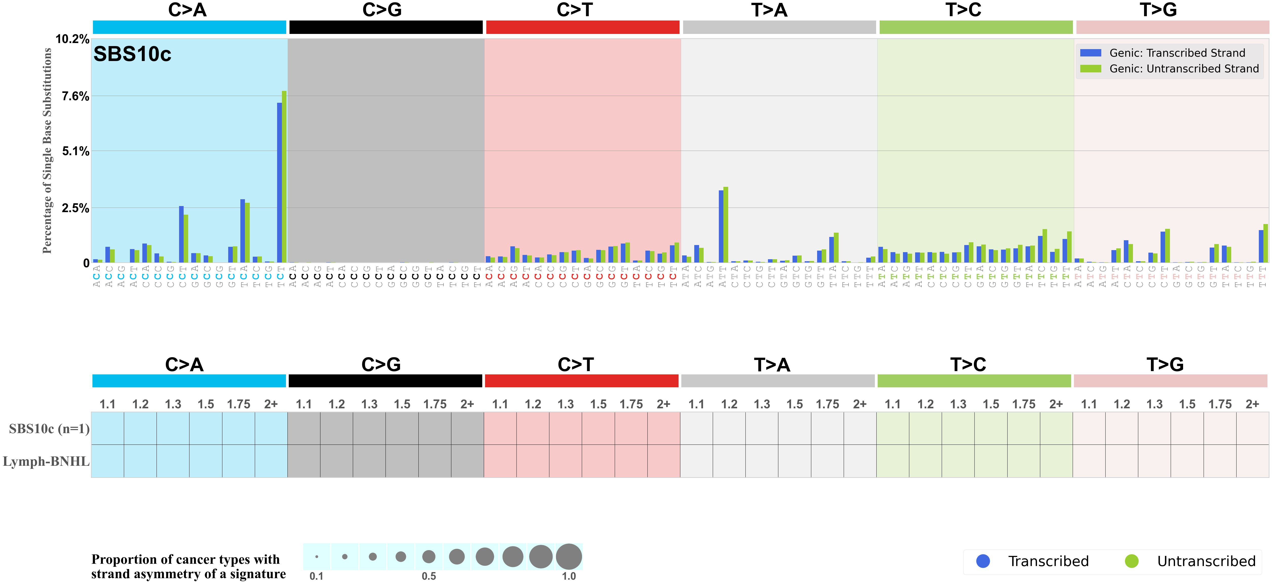 Each mutation attributed to the mutational signature is annotated as either on the transcribed strand, untranscribed strand, or non-transcribed strand.