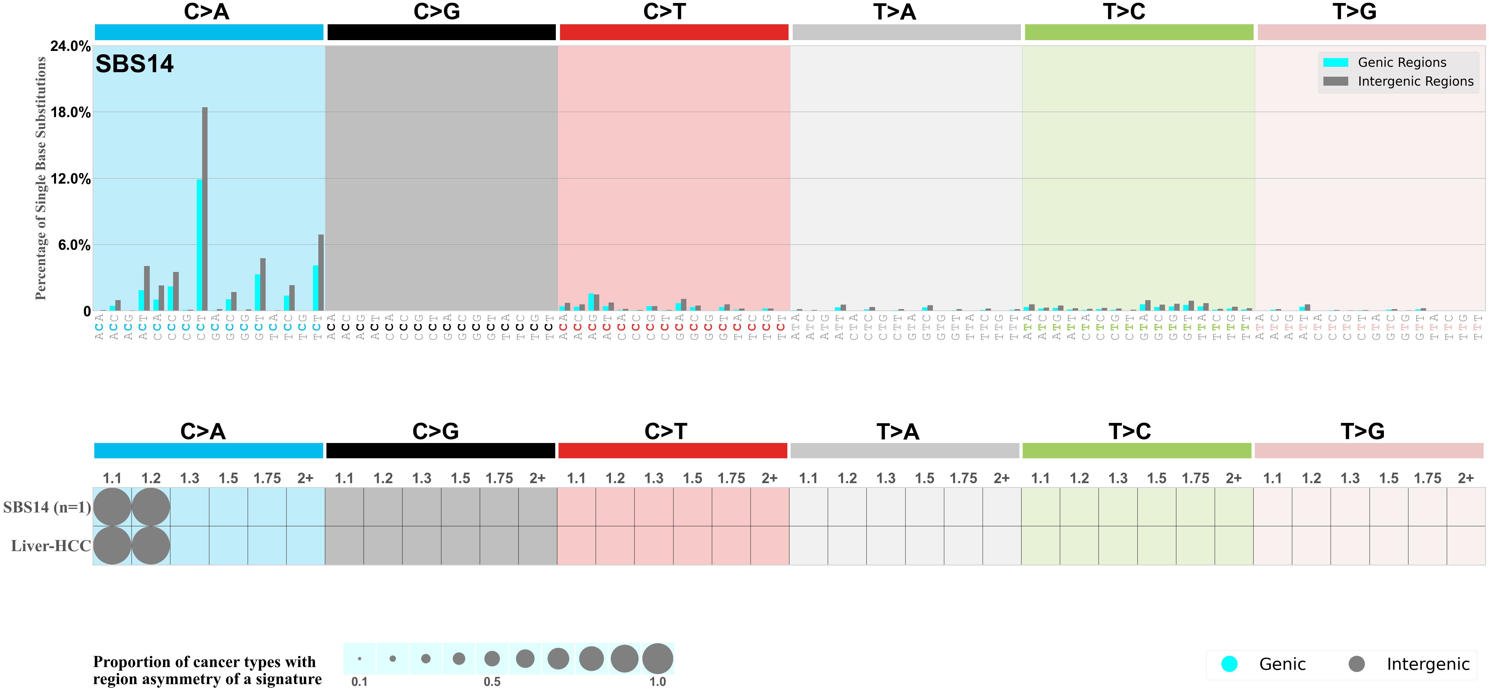 In the lower circle plot, the circles are filled with the colour of the significant region when there is an odds ratio of at least 1.1 with statistical significance. The first row of this plot displays the genic versus intergenic region asymmetry across all cancer types, while the remaining rows present genic versus intergenic region asymmetry for each cancer type.