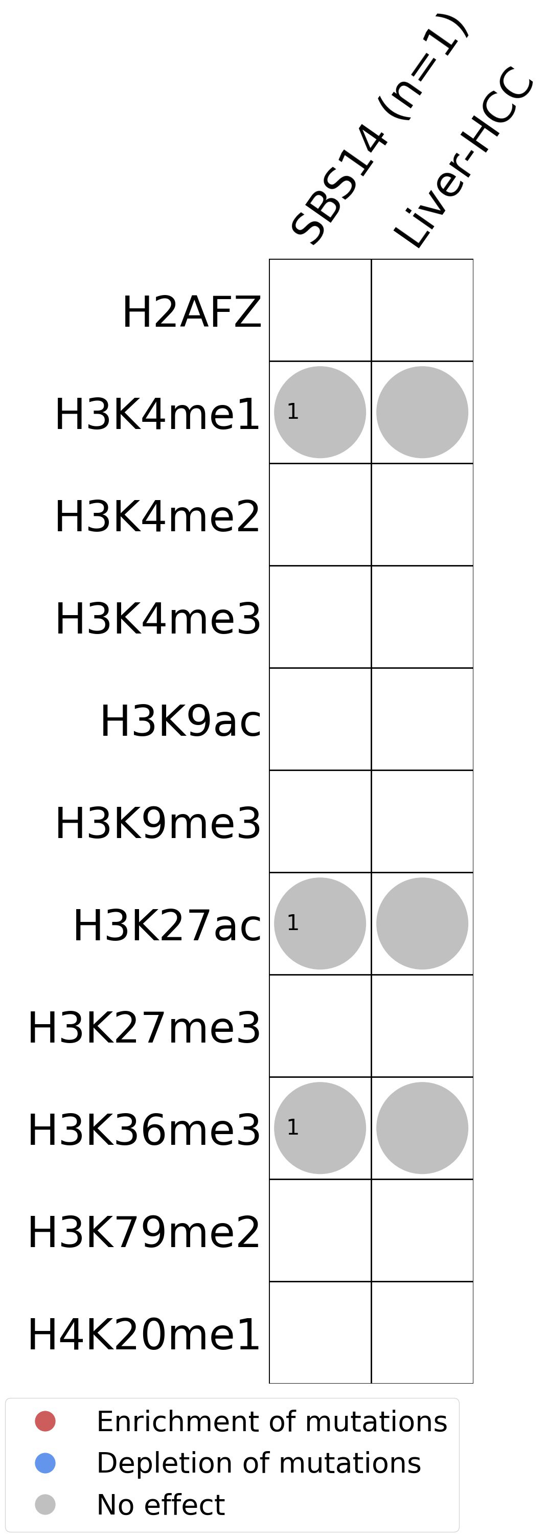 This plot shows the associations between mutational signatures and histone marks. Pie charts display the number of cancer types that are either enriched, depleted, or have no statistical effect for a given mutational signature and a specific histone mark. Differential changes are calculated by statistically comparing the of average signals between real and simulated mutations using a 100 base window centered at the somatic mutation. Enrichments reflect at least 5% statistically significant increases in real signal when compared to simulated signal. Depletions reflect at least 5% statistically significant decreases in real signal when compared to simulated signal. Statistical significance is determined based on false-discovery rate corrected p-value below 0.05.