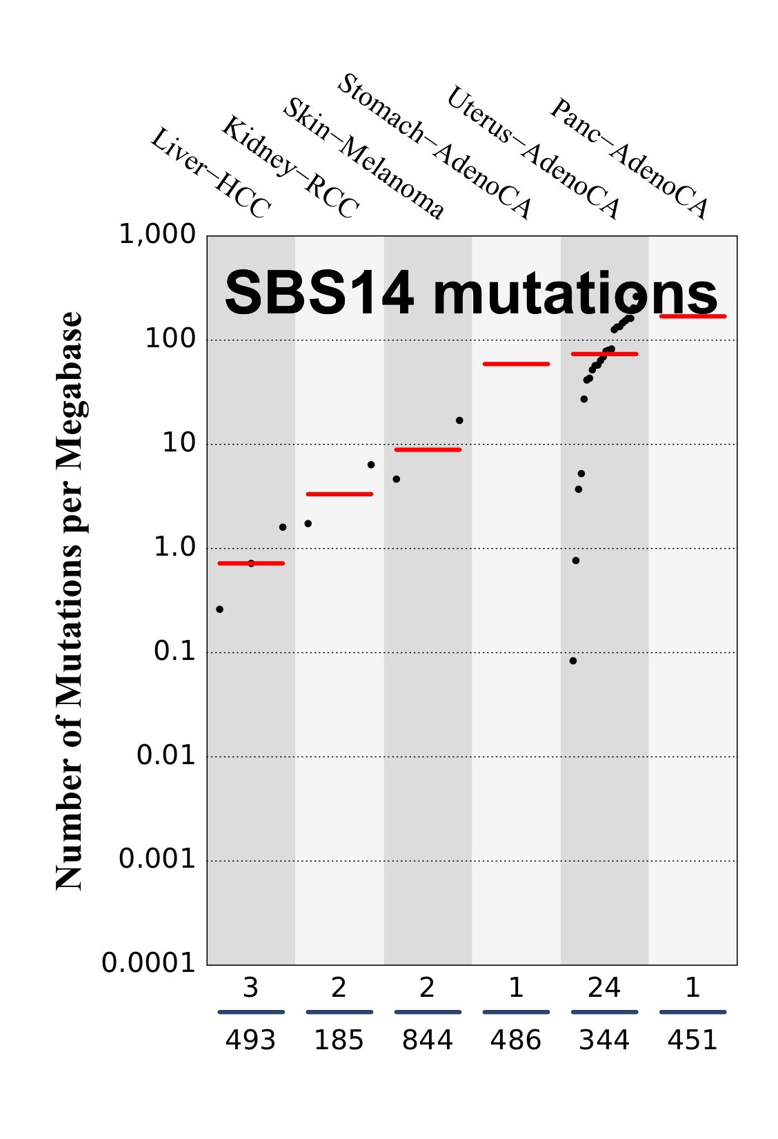 SBS14 mutations are present in very high numbers in all samples in which it has been observed. SBS14 is one of seven mutational signatures associated with defective DNA mismatch repair and microsatellite instability (MSI) and is often found in the same samples as other MSI associated signatures: SBS6, SBS15, SBS20, SBS21, SBS26 and SBS44.
