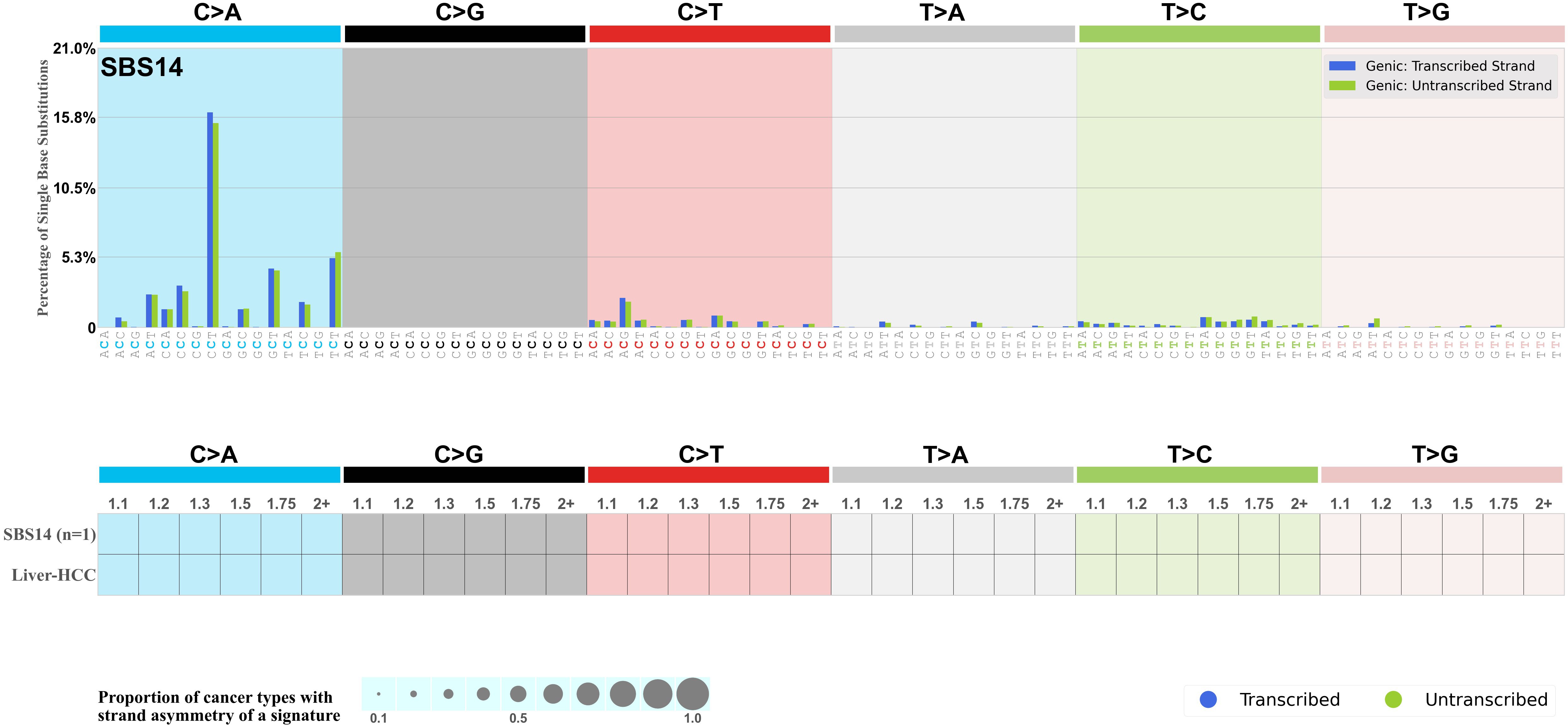 Mutational signatures exhibit asymmetric number of mutations due to either one of the DNA strands being preferentially repaired or one of the DNA strands having a higher propensity for being damaged. One common example of strand asymmetry is transcription-strand asymmetry which can be due to the activity of transcription-coupled nucleotide excision repair (TC-NER) or transcription-coupled damage amongst others.