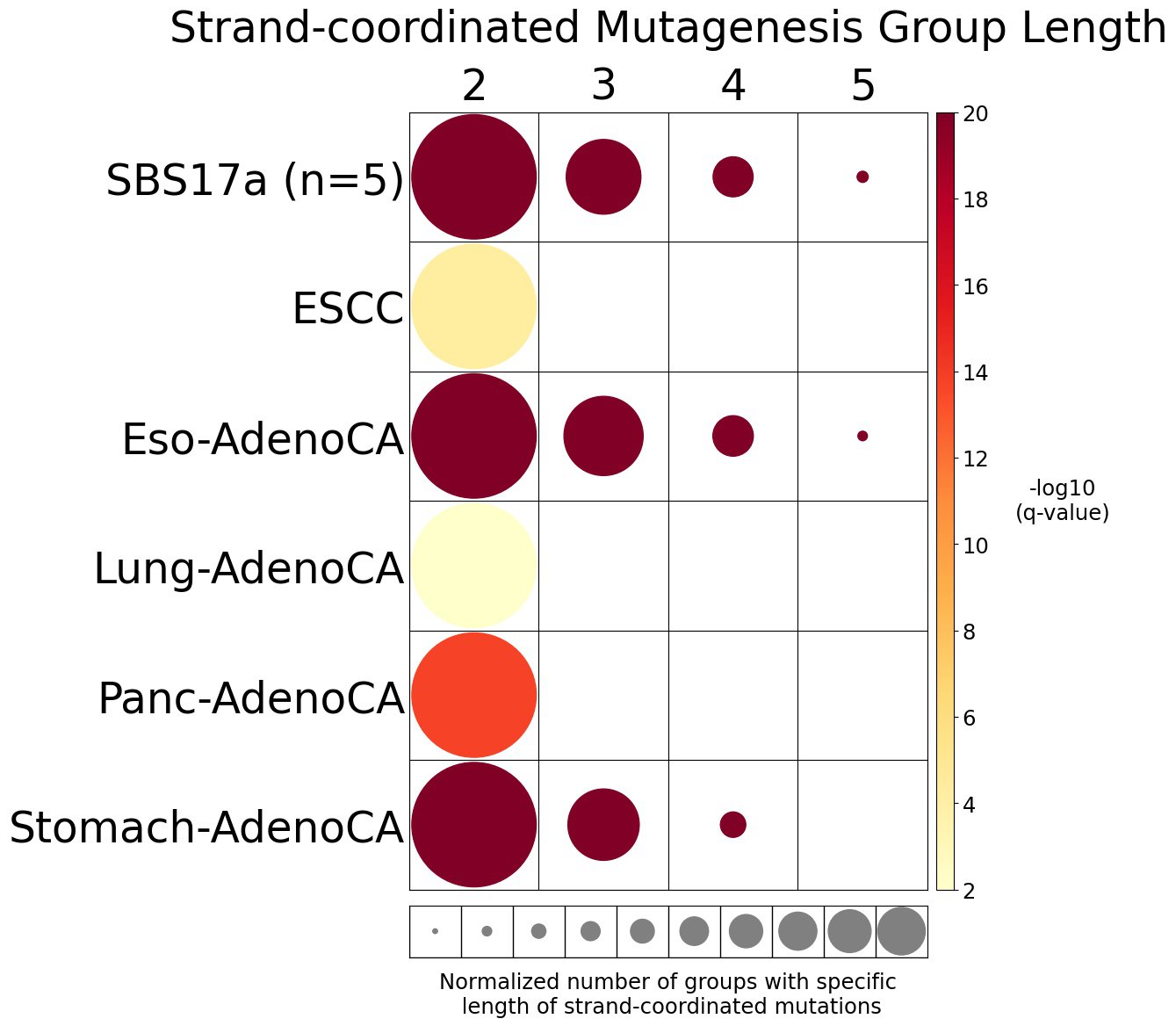 Strand-coordinated mutagenesis analysis identifies groups of consecutive single-base substitutions on the same DNA strand with the same pyrimidine mutation context (e.g., consecutive C>A, C>A, C>A) attributed to the same mutational signature within a sample.