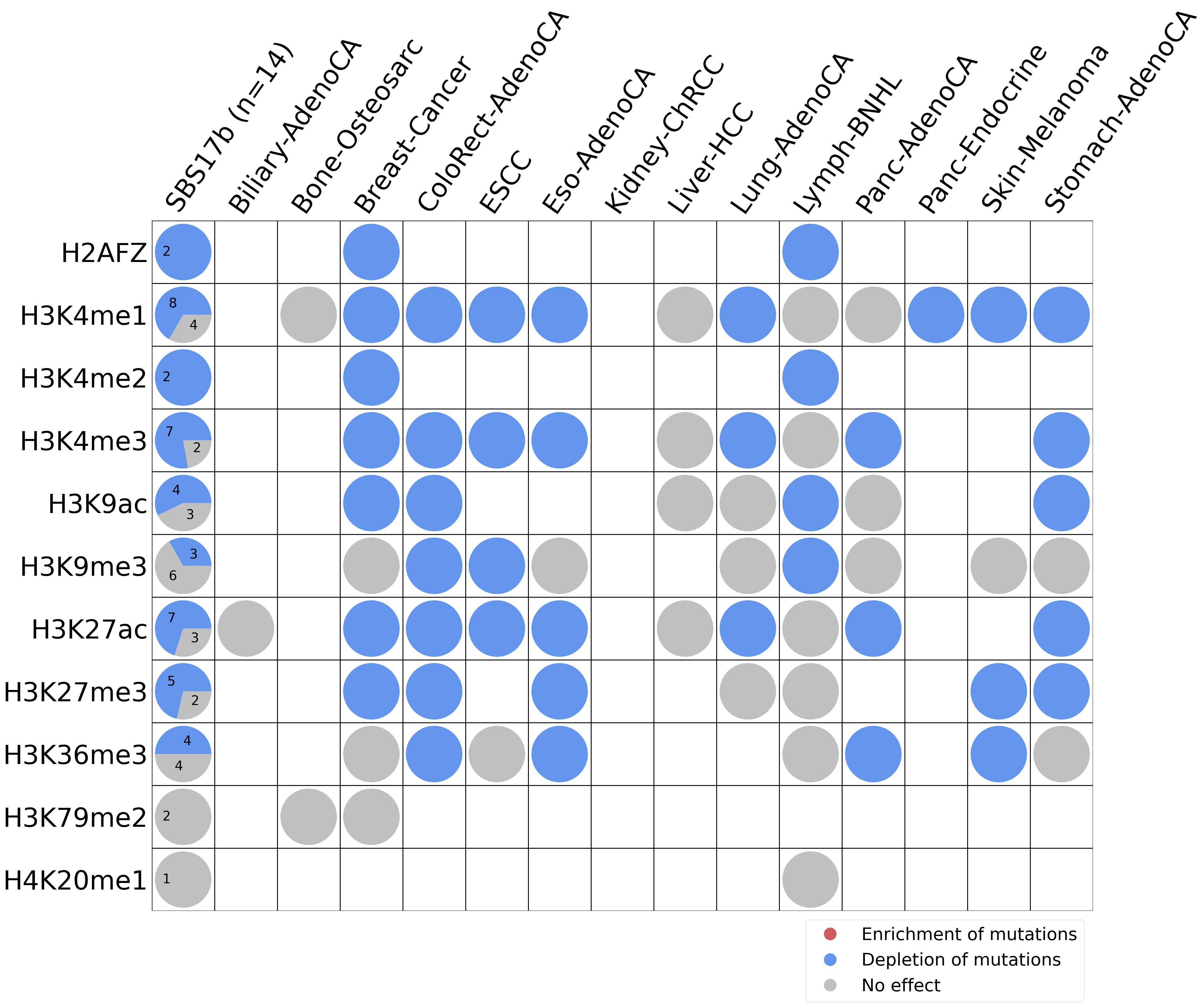 This plot shows the associations between mutational signatures and histone marks. Pie charts display the number of cancer types that are either enriched, depleted, or have no statistical effect for a given mutational signature and a specific histone mark. Differential changes are calculated by statistically comparing the of average signals between real and simulated mutations using a 100 base window centered at the somatic mutation. Enrichments reflect at least 5% statistically significant increases in real signal when compared to simulated signal. Depletions reflect at least 5% statistically significant decreases in real signal when compared to simulated signal. Statistical significance is determined based on false-discovery rate corrected p-value below 0.05.