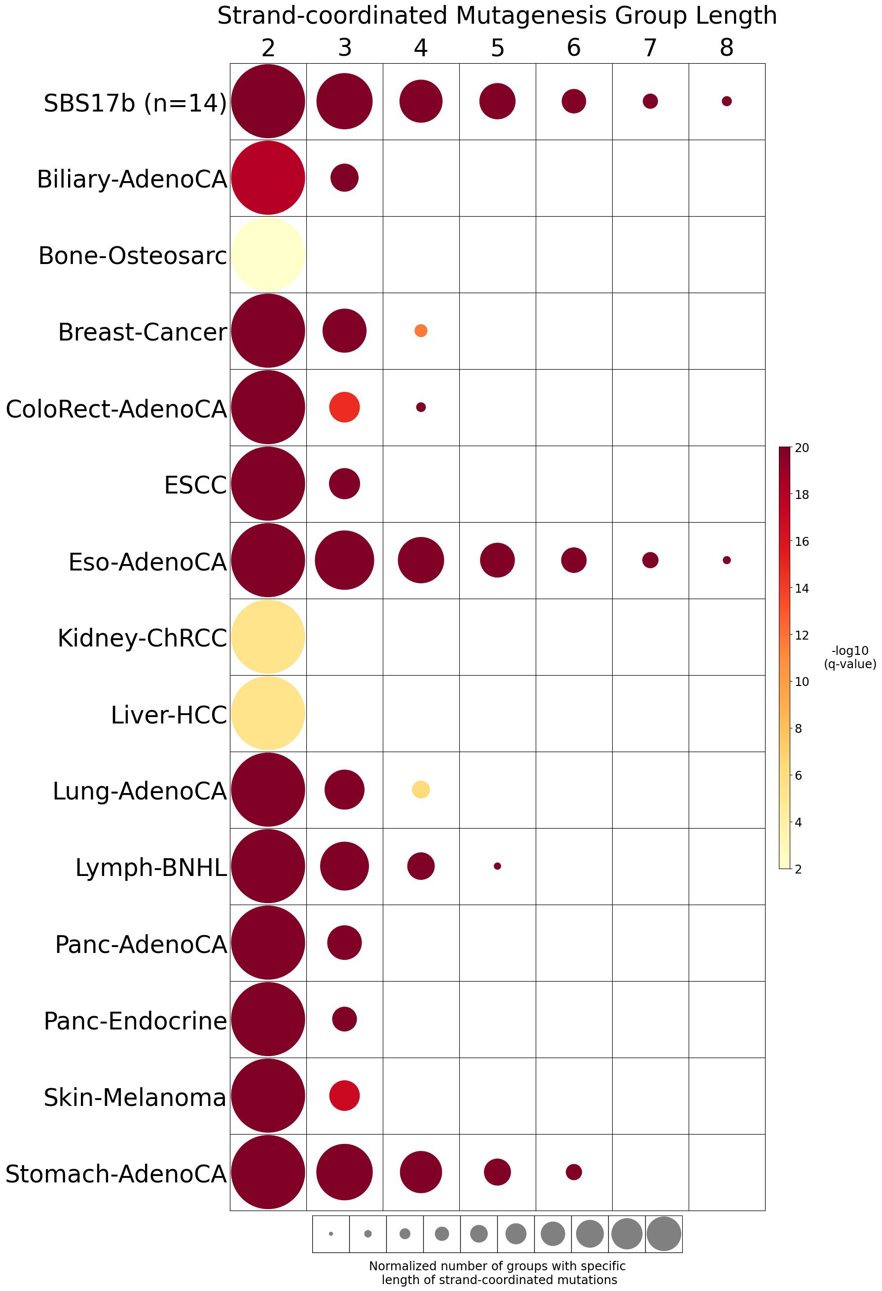 Somatic mutations are defined as consecutive if the inter-mutational distance between any two mutations is less than 10 kb. Strand-coordinated groups of varying lengths are pooled across six mutation contexts and samples for each mutational signature. The circle radius reflects the number of strand-coordinated groups, and the color shows the statistical significance of the observed number of strand-coordinated groups with respect to the expected ones coming from simulations for each group length. Circles filled with light gray color (if any) represents no statistical significance.