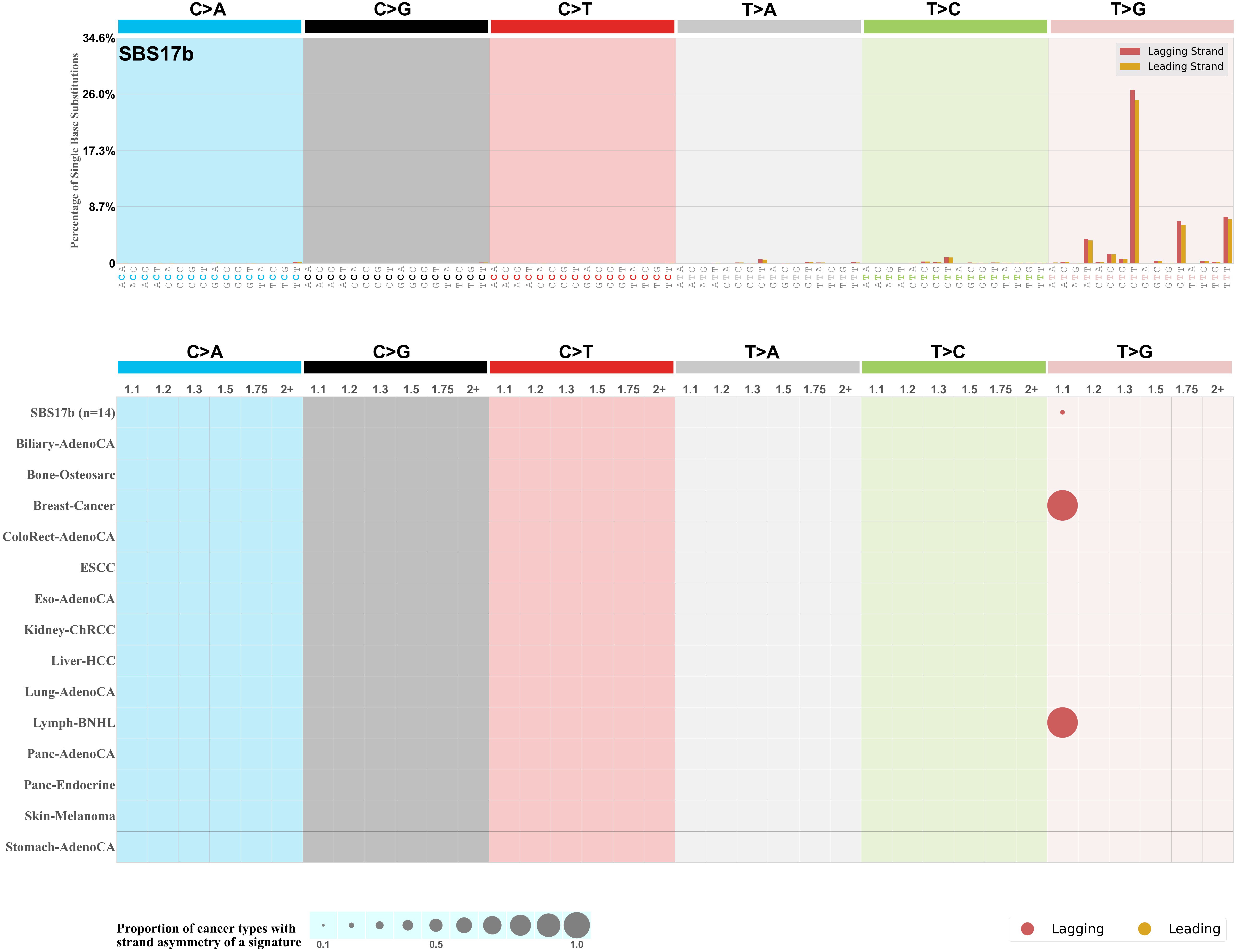 In the lower circle plot, the circles are filled with the colour of the significant strand when there is an odds ratio of at least 1.1 with statistical significance. The first row of this plot displays the replicational strand asymmetry across all cancer types, while the remaining rows present replicational strand asymmetry for each cancer type.