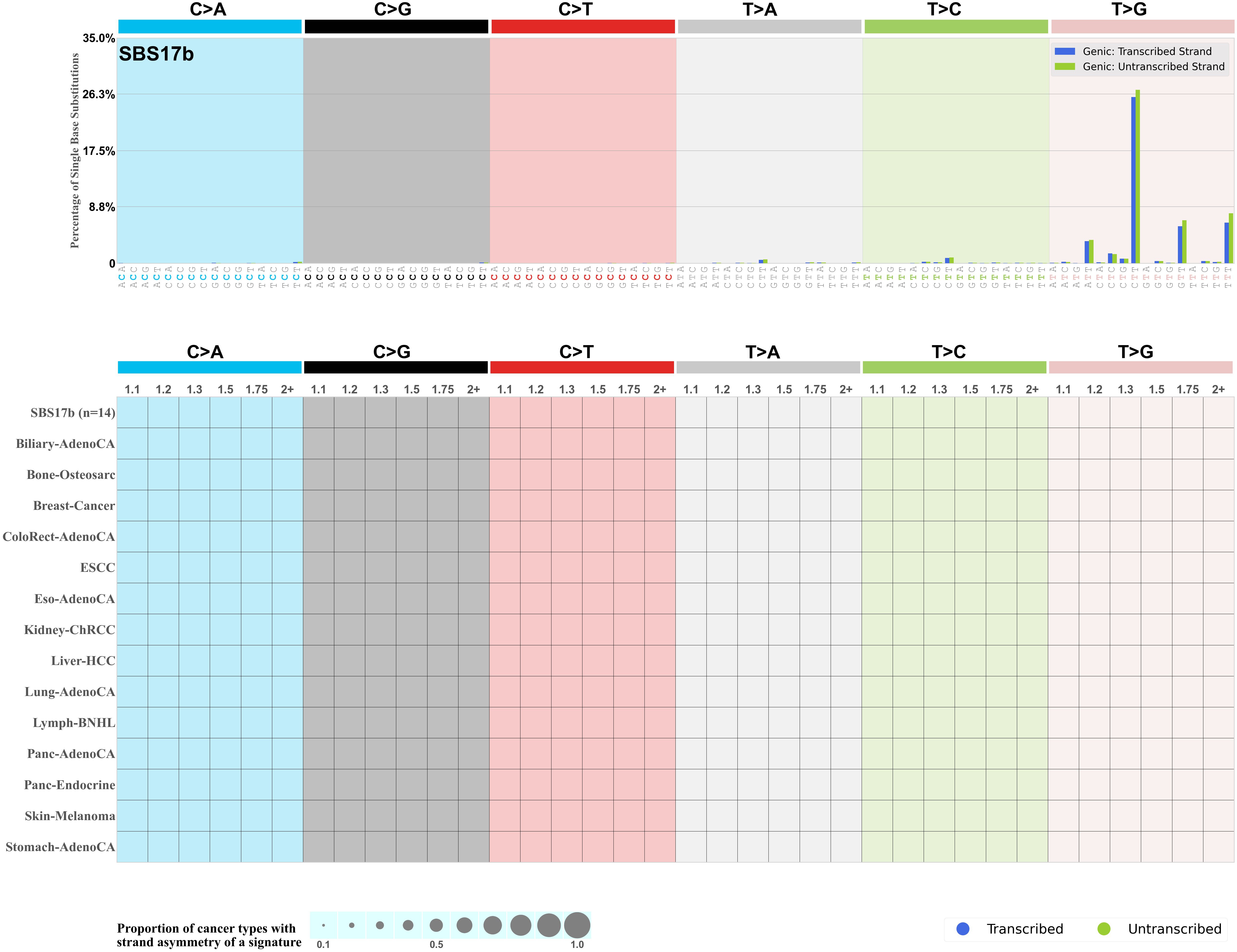 In the lower circle plot, the circles are filled with the colour of the significant strand when there is an odds ratio of at least 1.1 with statistical significance. The first row of this plot displays the transcriptional strand asymmetry across all cancer types, while the remaining rows present transcriptional strand asymmetry for each cancer type.