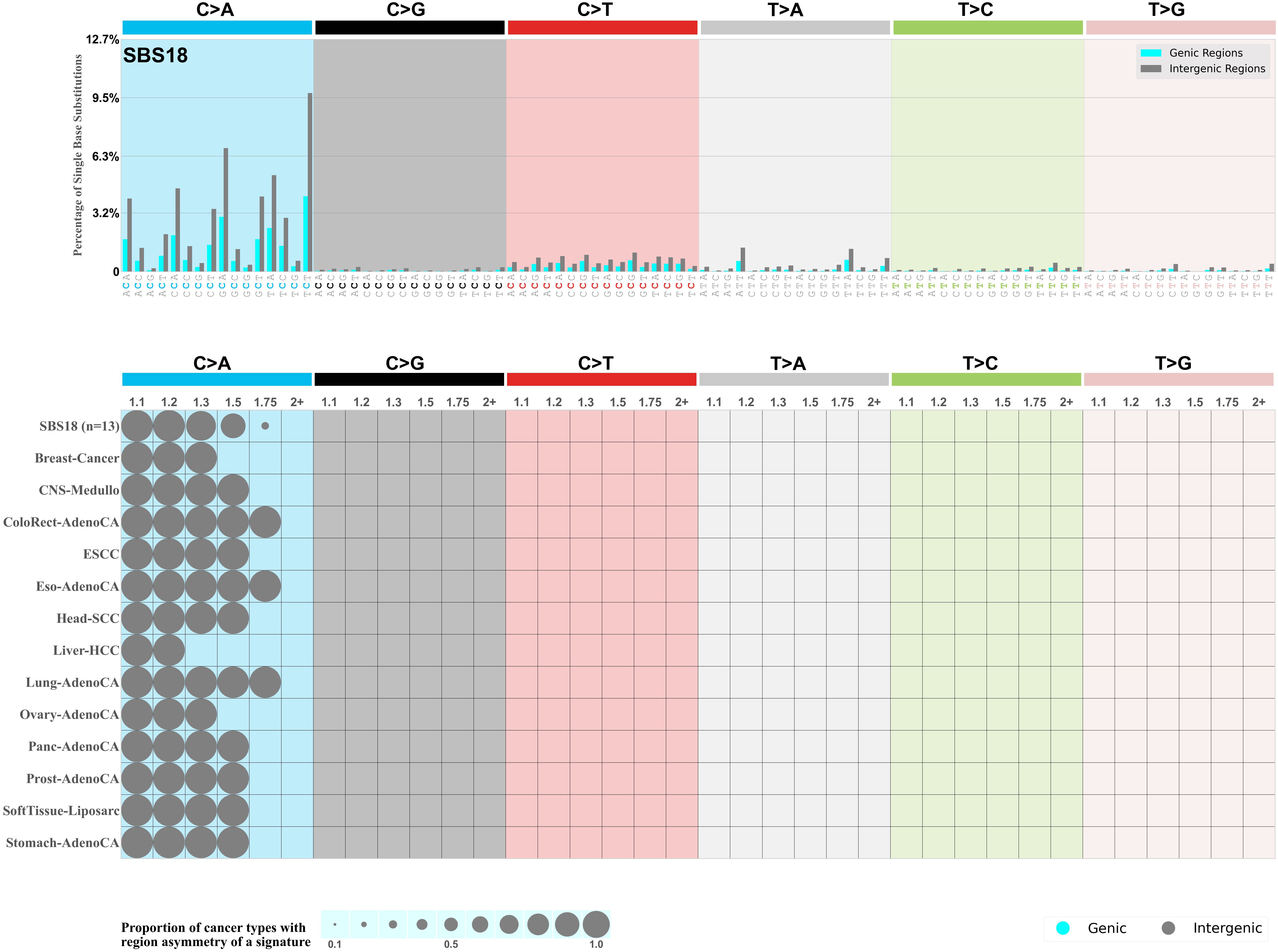 In the lower circle plot, the circles are filled with the colour of the significant region when there is an odds ratio of at least 1.1 with statistical significance. The first row of this plot displays the genic versus intergenic region asymmetry across all cancer types, while the remaining rows present genic versus intergenic region asymmetry for each cancer type.