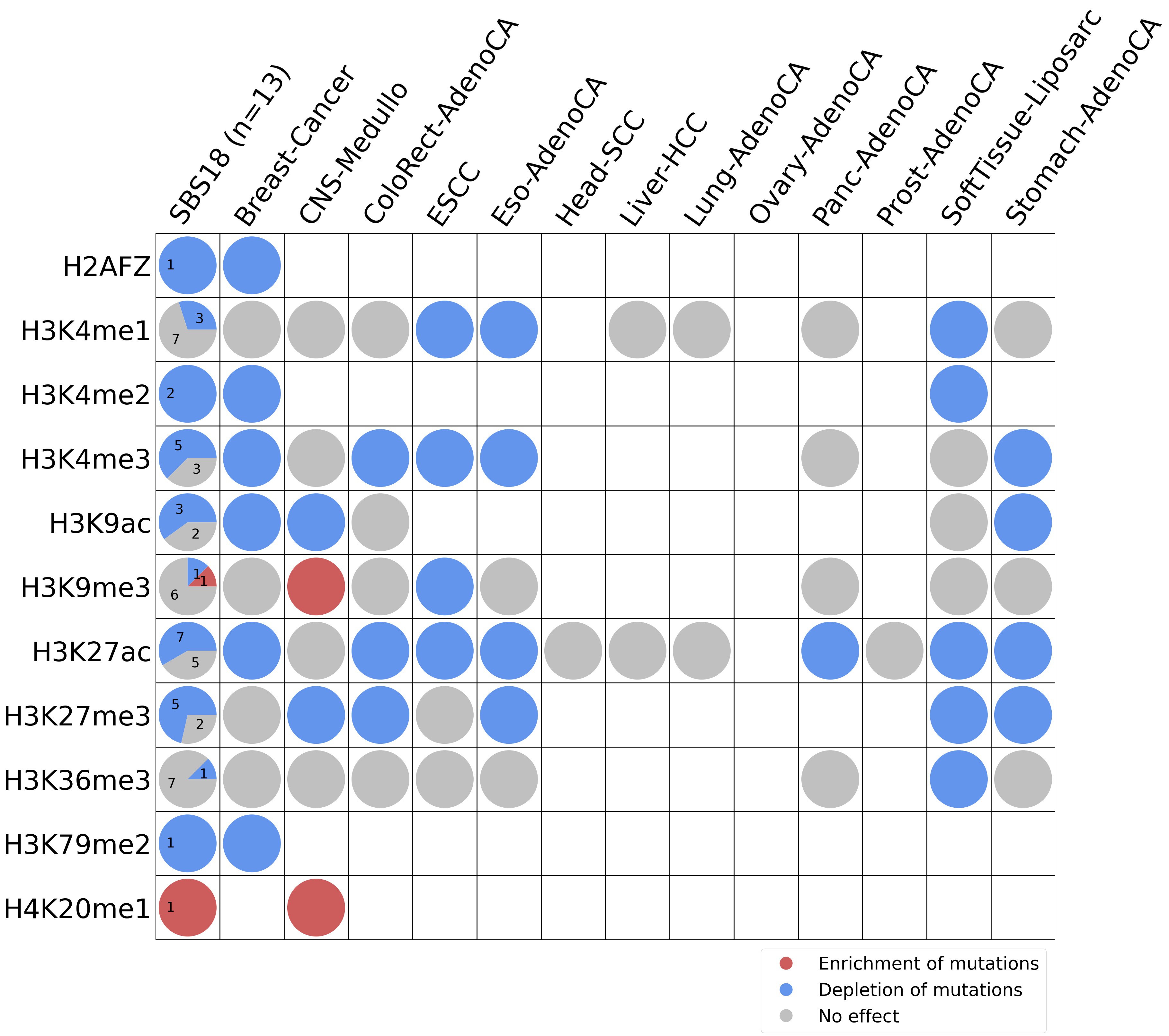 This plot shows the associations between mutational signatures and histone marks. Pie charts display the number of cancer types that are either enriched, depleted, or have no statistical effect for a given mutational signature and a specific histone mark. Differential changes are calculated by statistically comparing the of average signals between real and simulated mutations using a 100 base window centered at the somatic mutation. Enrichments reflect at least 5% statistically significant increases in real signal when compared to simulated signal. Depletions reflect at least 5% statistically significant decreases in real signal when compared to simulated signal. Statistical significance is determined based on false-discovery rate corrected p-value below 0.05.