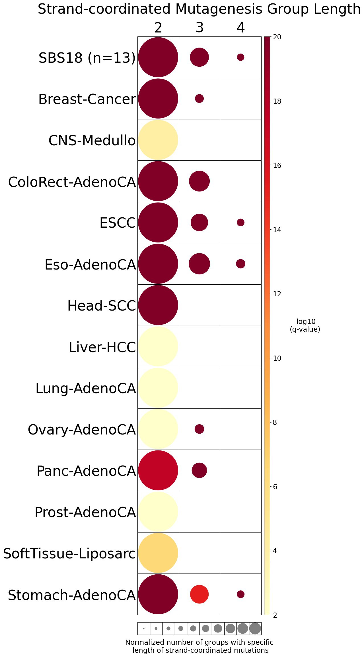 Somatic mutations are defined as consecutive if the inter-mutational distance between any two mutations is less than 10 kb. Strand-coordinated groups of varying lengths are pooled across six mutation contexts and samples for each mutational signature. The circle radius reflects the number of strand-coordinated groups, and the color shows the statistical significance of the observed number of strand-coordinated groups with respect to the expected ones coming from simulations for each group length. Circles filled with light gray color (if any) represents no statistical significance.