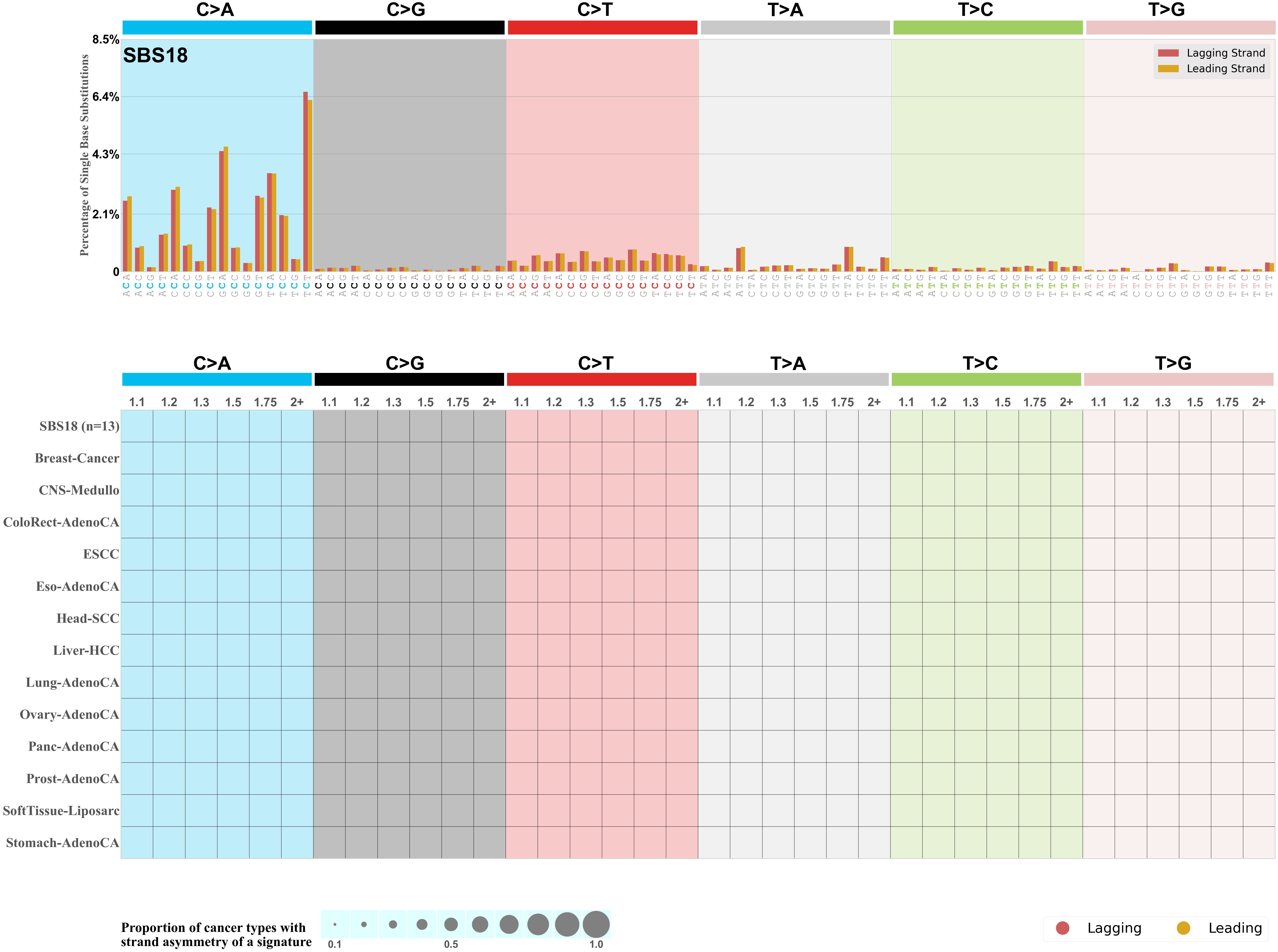 In the lower circle plot, the circles are filled with the colour of the significant strand when there is an odds ratio of at least 1.1 with statistical significance. The first row of this plot displays the replicational strand asymmetry across all cancer types, while the remaining rows present replicational strand asymmetry for each cancer type.