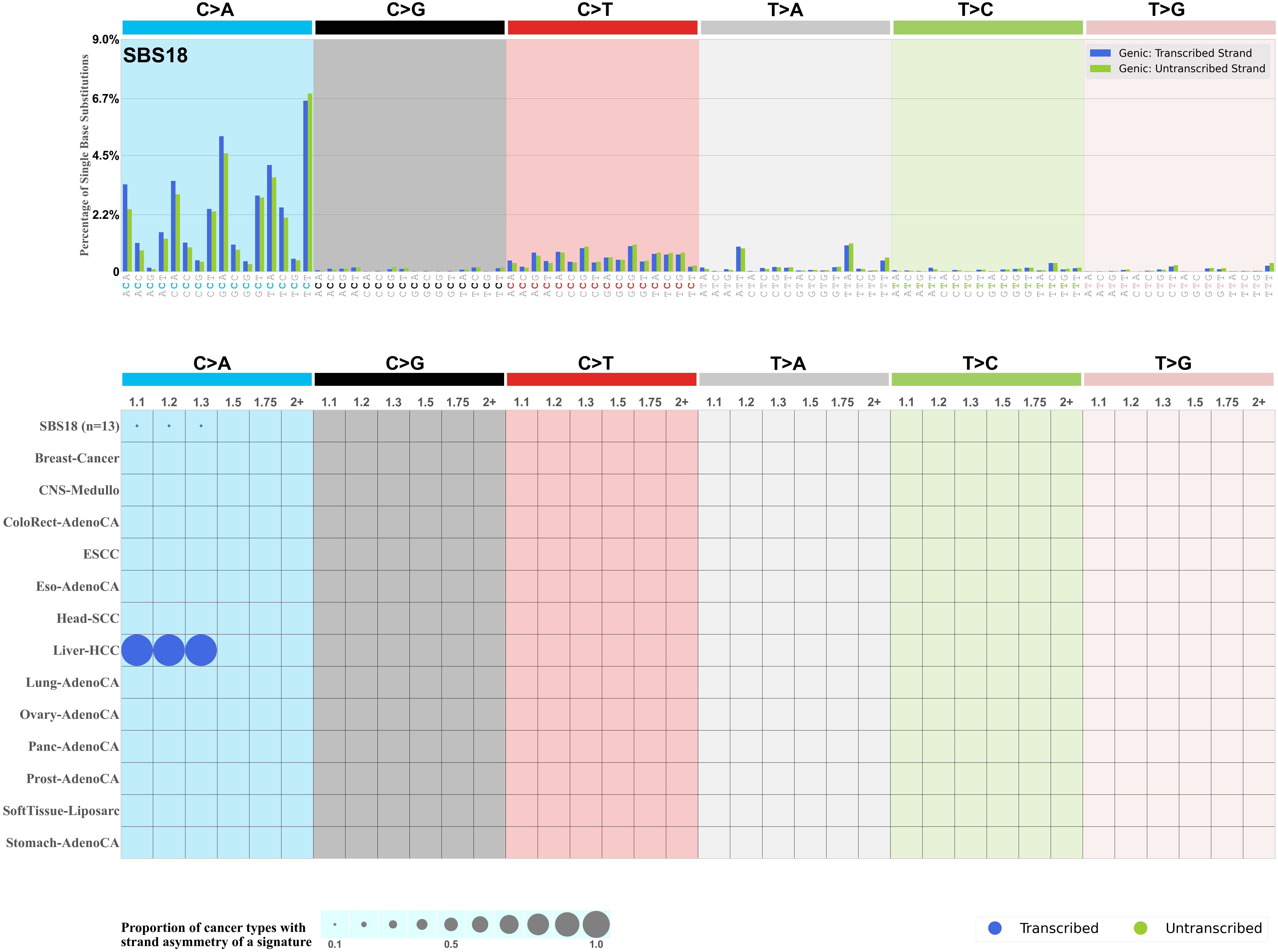 In the lower circle plot, the circles are filled with the colour of the significant strand when there is an odds ratio of at least 1.1 with statistical significance. The first row of this plot displays the transcriptional strand asymmetry across all cancer types, while the remaining rows present transcriptional strand asymmetry for each cancer type.