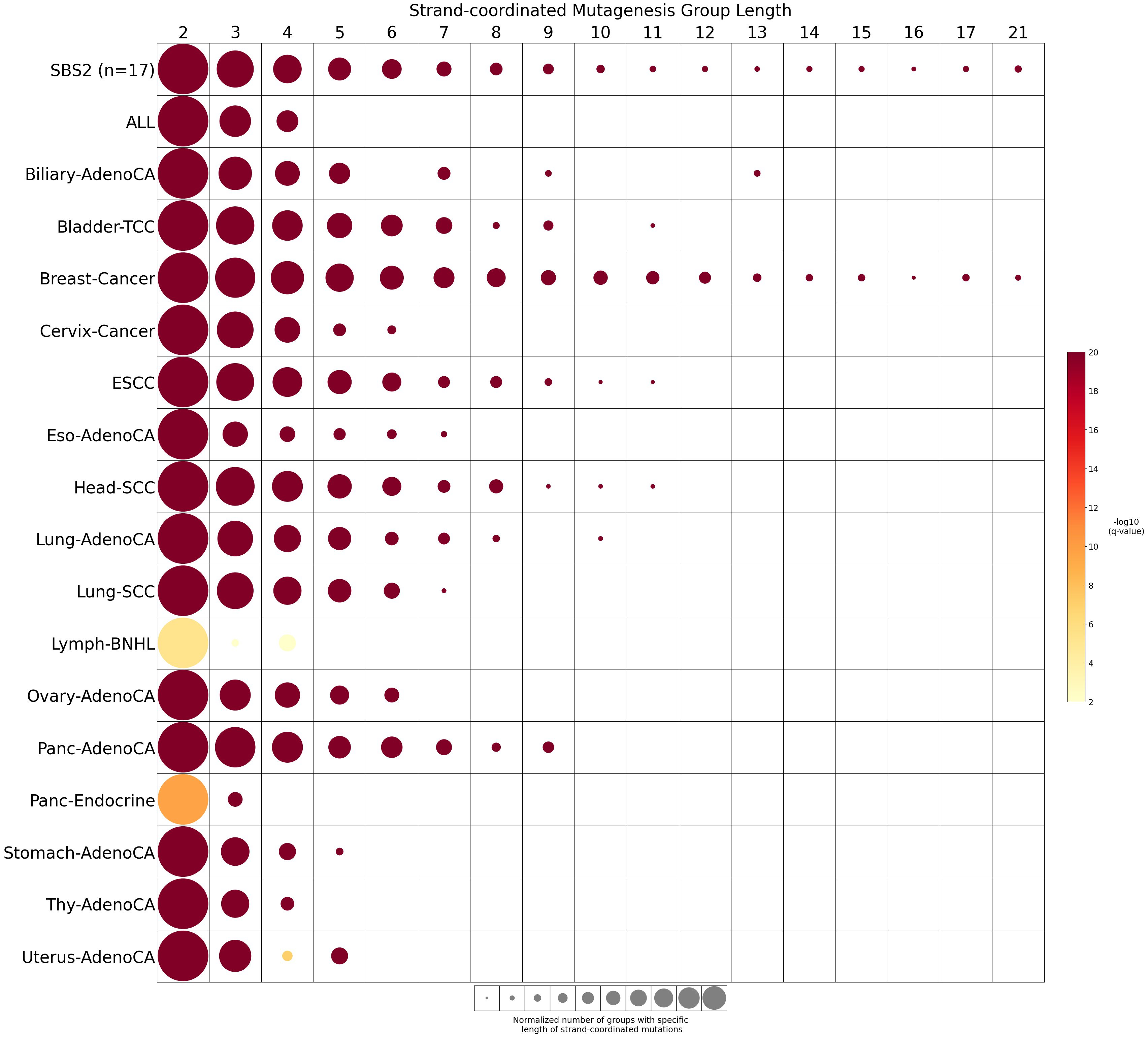 Somatic mutations are defined as consecutive if the inter-mutational distance between any two mutations is less than 10 kb. Strand-coordinated groups of varying lengths are pooled across six mutation contexts and samples for each mutational signature. The circle radius reflects the number of strand-coordinated groups, and the color shows the statistical significance of the observed number of strand-coordinated groups with respect to the expected ones coming from simulations for each group length. Circles filled with light gray color (if any) represents no statistical significance.