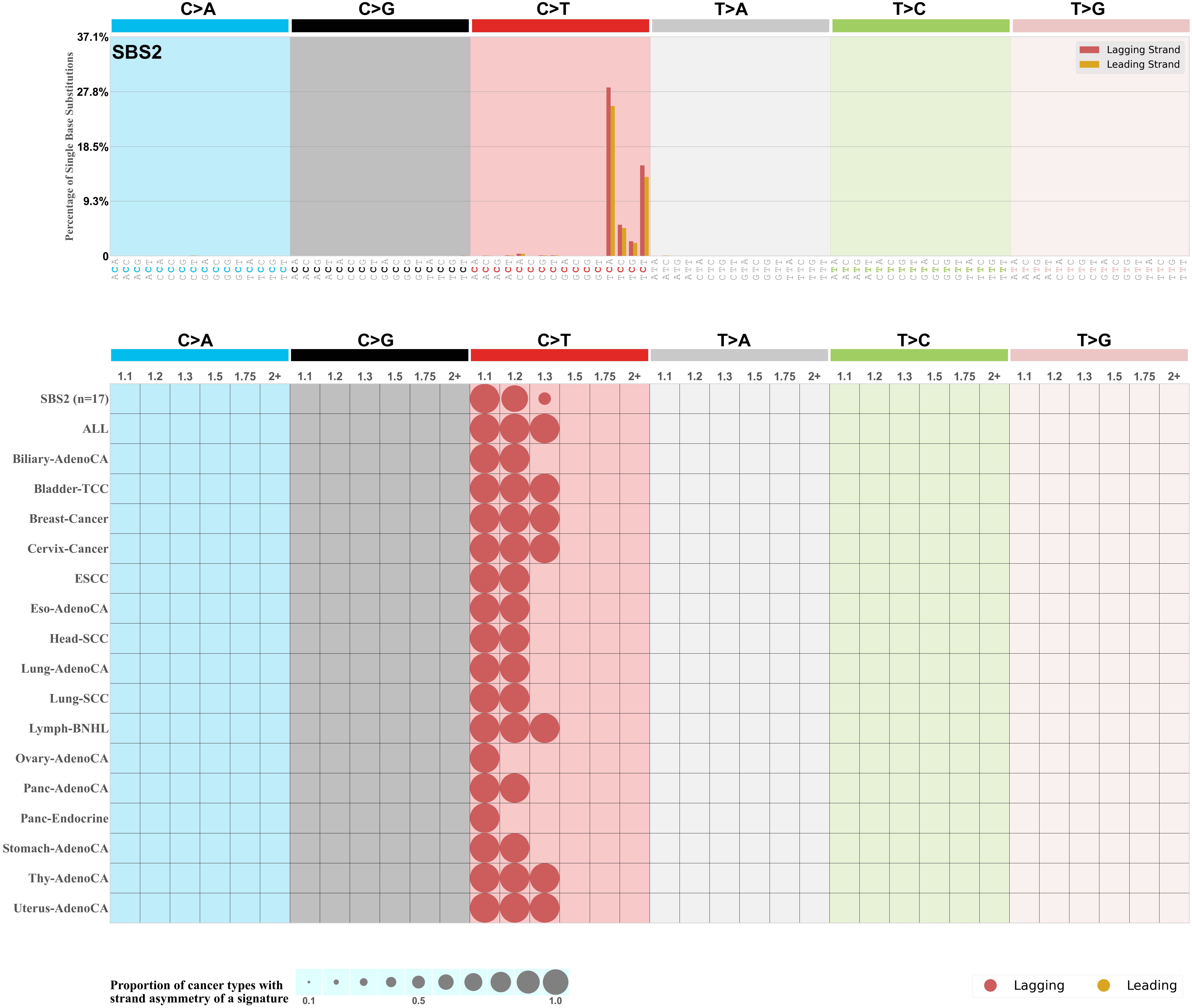 In the lower circle plot, the circles are filled with the colour of the significant strand when there is an odds ratio of at least 1.1 with statistical significance. The first row of this plot displays the replicational strand asymmetry across all cancer types, while the remaining rows present replicational strand asymmetry for each cancer type.