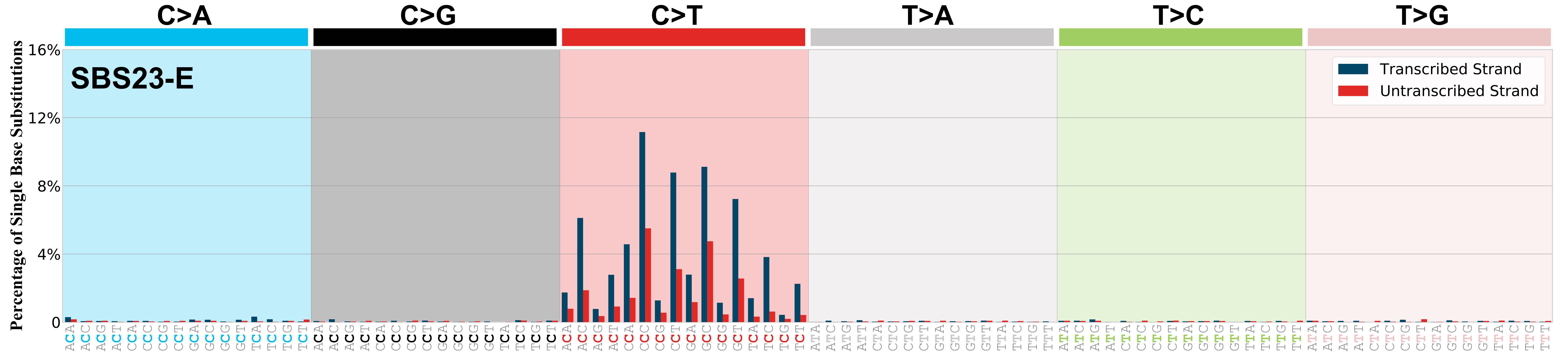 SBS23 exhibits strong transcriptional strand bias for C>T mutations with more mutations of G than C on the untranscribed strands of genes consistent with damage to guanine and repair by transcription-coupled nucleotide excision repair. Please note that SBS23 has only been found in exome sequencing data and, as such, the transcriptional strand bias reflects the one observed in the coding regions of the genome.
