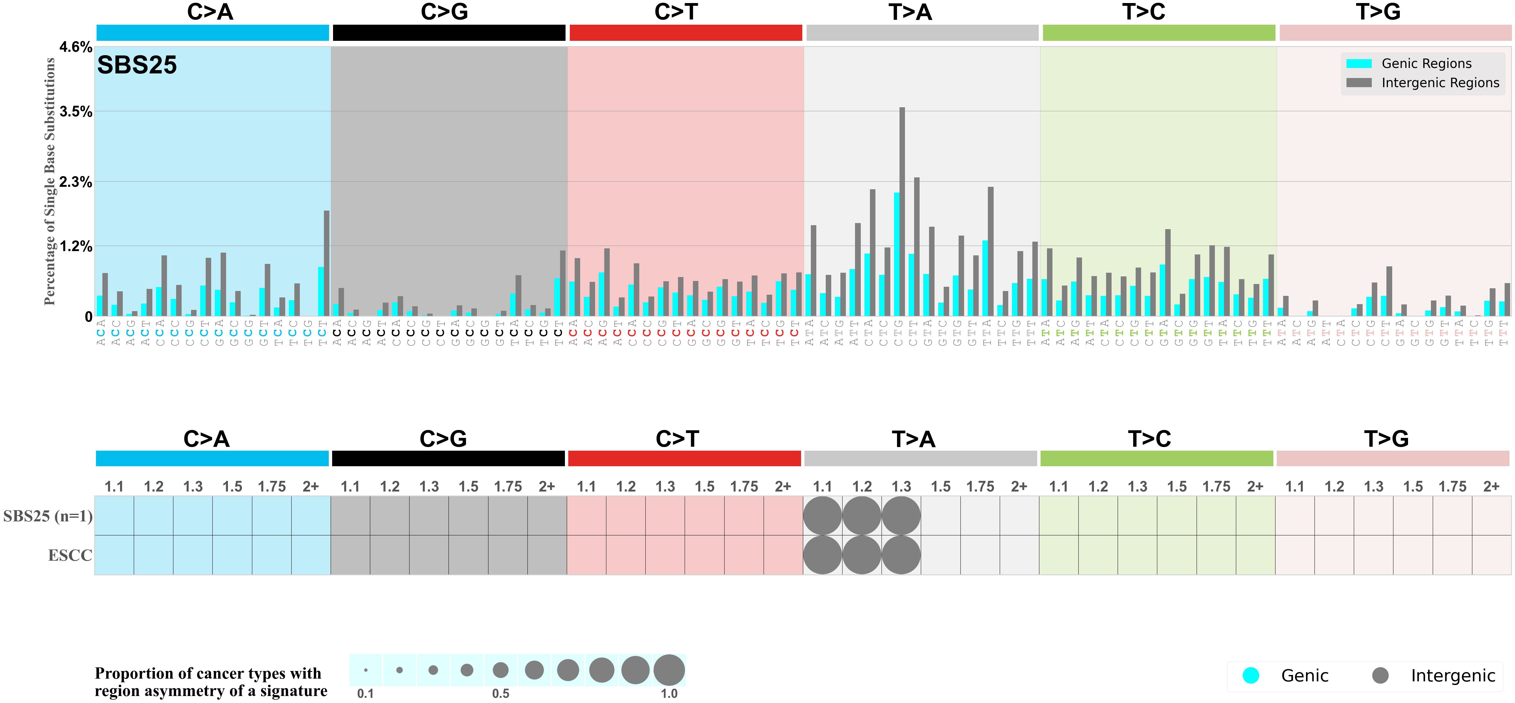In the lower circle plot, the circles are filled with the colour of the significant region when there is an odds ratio of at least 1.1 with statistical significance. The first row of this plot displays the genic versus intergenic region asymmetry across all cancer types, while the remaining rows present genic versus intergenic region asymmetry for each cancer type.