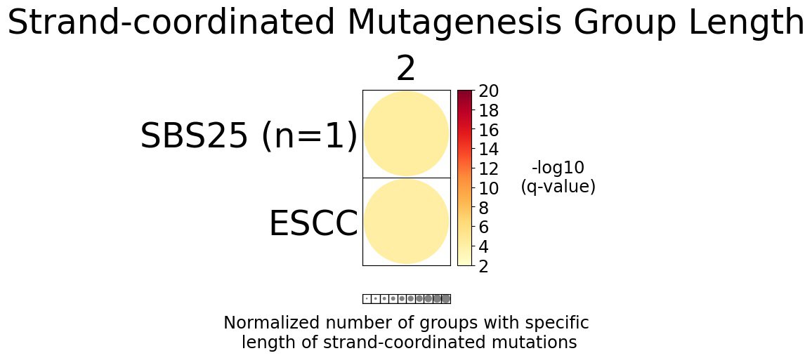 Strand-coordinated mutagenesis analysis identifies groups of consecutive single-base substitutions on the same DNA strand with the same pyrimidine mutation context (e.g., consecutive C>A, C>A, C>A) attributed to the same mutational signature within a sample.
