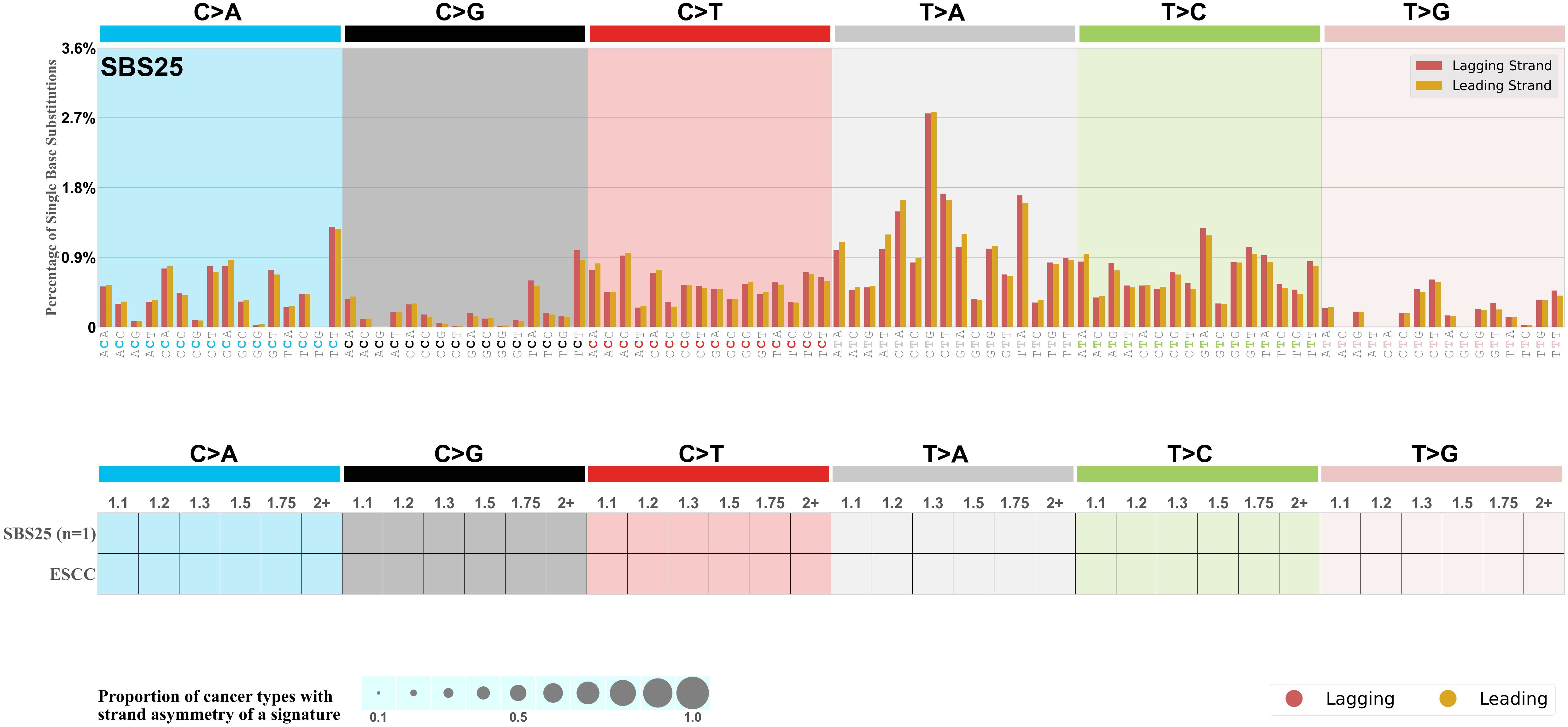 Each mutation attributed to the mutational signature is annotated as either on the lagging strand or the leading strand.