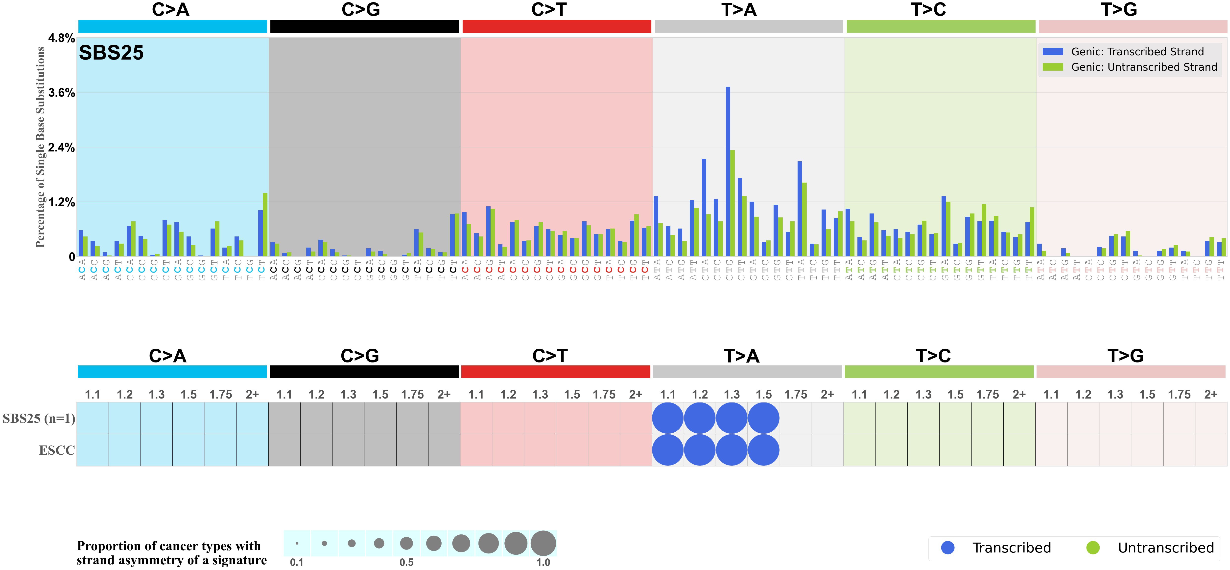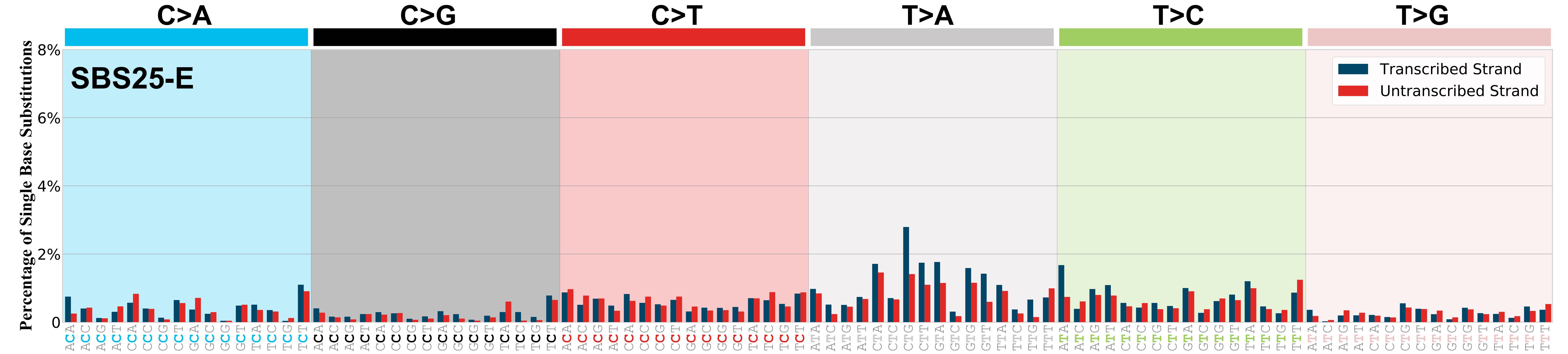 Mutational signatures exhibit asymmetric number of mutations due to either one of the DNA strands being preferentially repaired or one of the DNA strands having a higher propensity for being damaged. One common example of strand asymmetry is transcription-strand asymmetry which can be due to the activity of transcription-coupled nucleotide excision repair (TC-NER) or transcription-coupled damage amongst others.