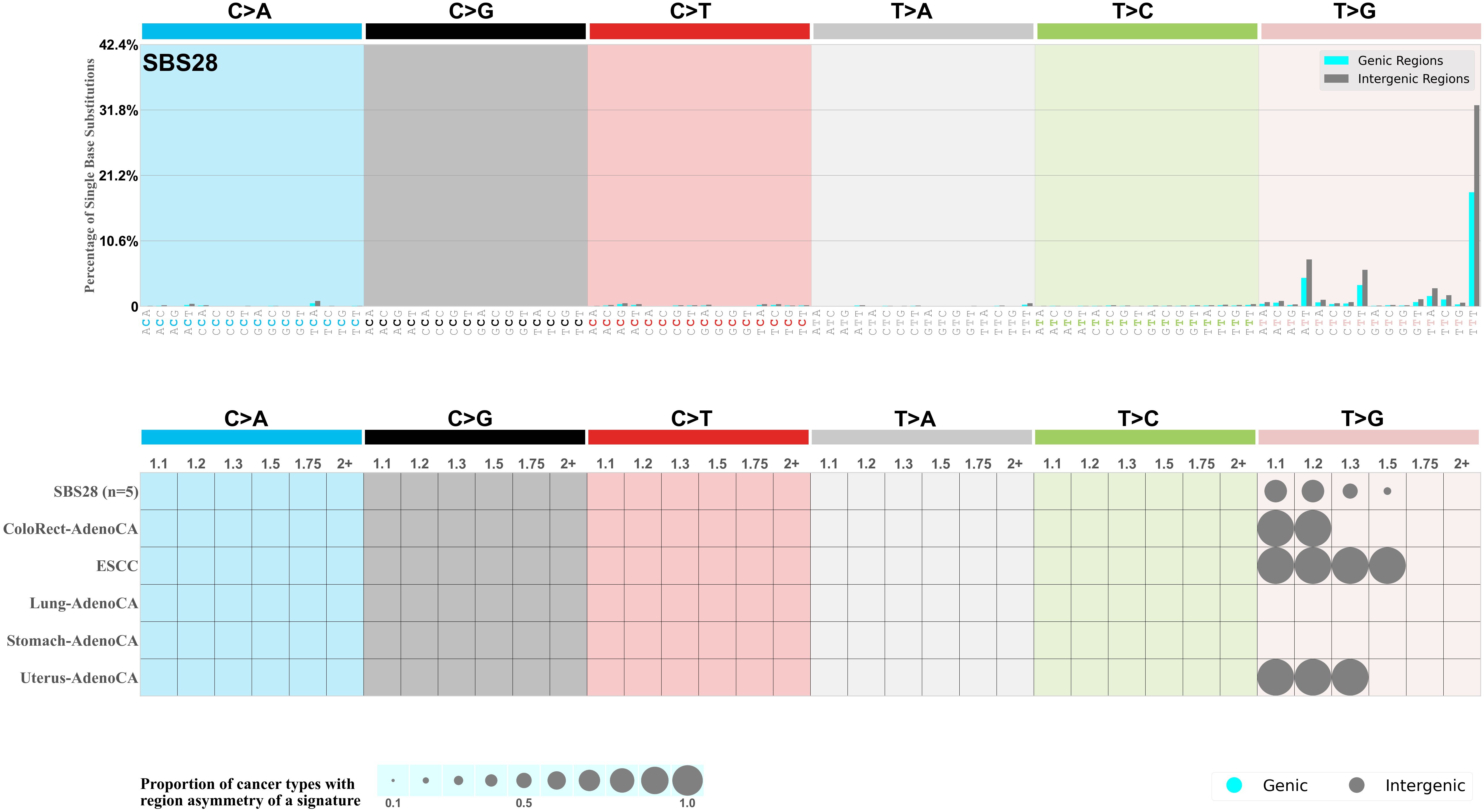 In the lower circle plot, the circles are filled with the colour of the significant region when there is an odds ratio of at least 1.1 with statistical significance. The first row of this plot displays the genic versus intergenic region asymmetry across all cancer types, while the remaining rows present genic versus intergenic region asymmetry for each cancer type.
