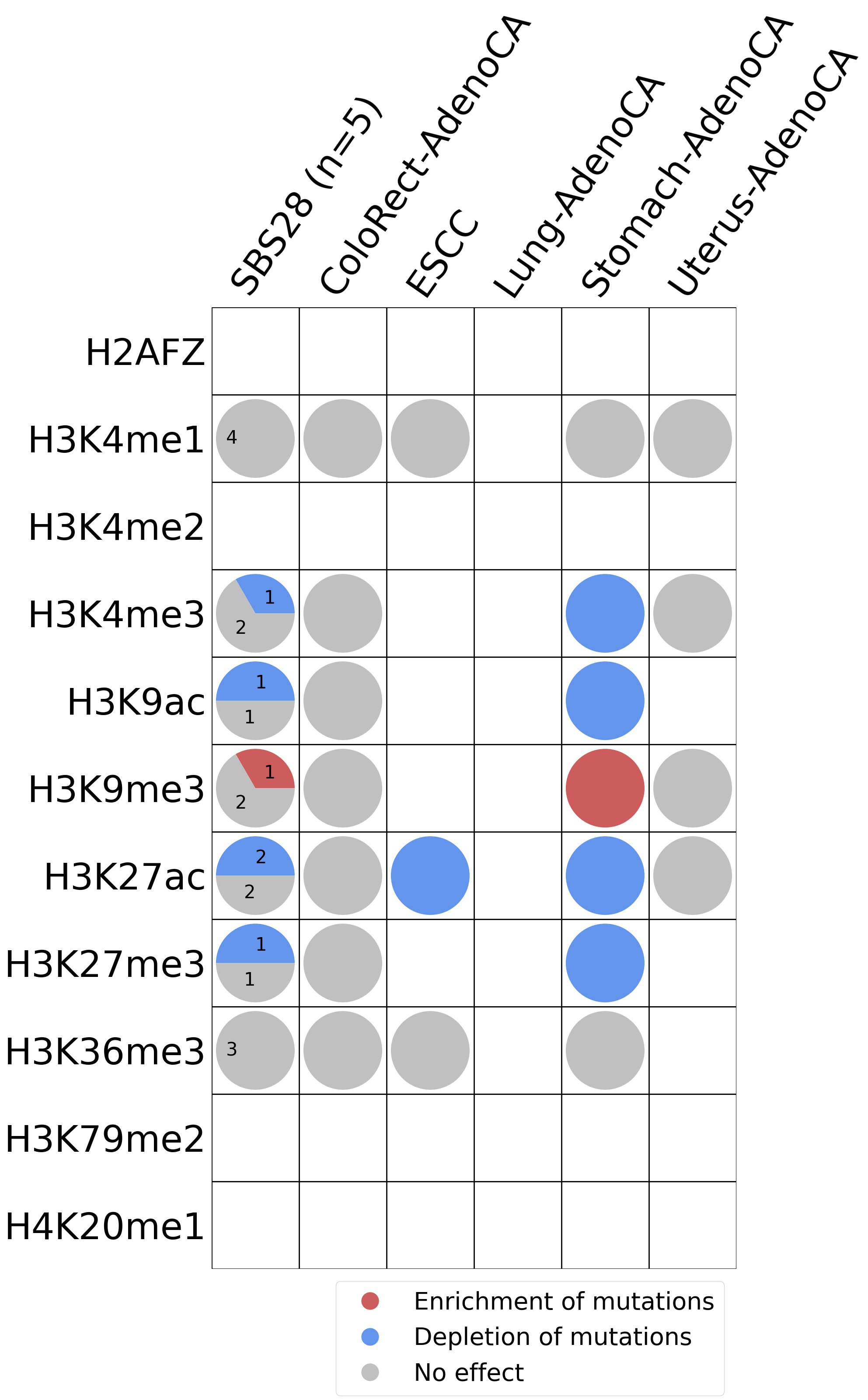 This plot shows the associations between mutational signatures and histone marks. Pie charts display the number of cancer types that are either enriched, depleted, or have no statistical effect for a given mutational signature and a specific histone mark. Differential changes are calculated by statistically comparing the of average signals between real and simulated mutations using a 100 base window centered at the somatic mutation. Enrichments reflect at least 5% statistically significant increases in real signal when compared to simulated signal. Depletions reflect at least 5% statistically significant decreases in real signal when compared to simulated signal. Statistical significance is determined based on false-discovery rate corrected p-value below 0.05.
