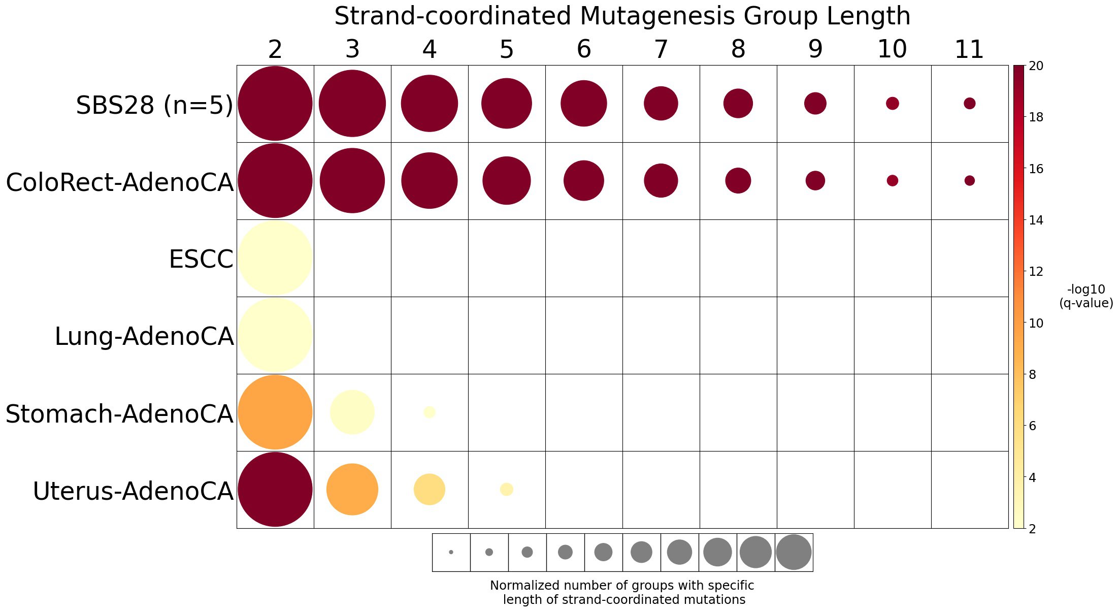 Somatic mutations are defined as consecutive if the inter-mutational distance between any two mutations is less than 10 kb. Strand-coordinated groups of varying lengths are pooled across six mutation contexts and samples for each mutational signature. The circle radius reflects the number of strand-coordinated groups, and the color shows the statistical significance of the observed number of strand-coordinated groups with respect to the expected ones coming from simulations for each group length. Circles filled with light gray color (if any) represents no statistical significance.