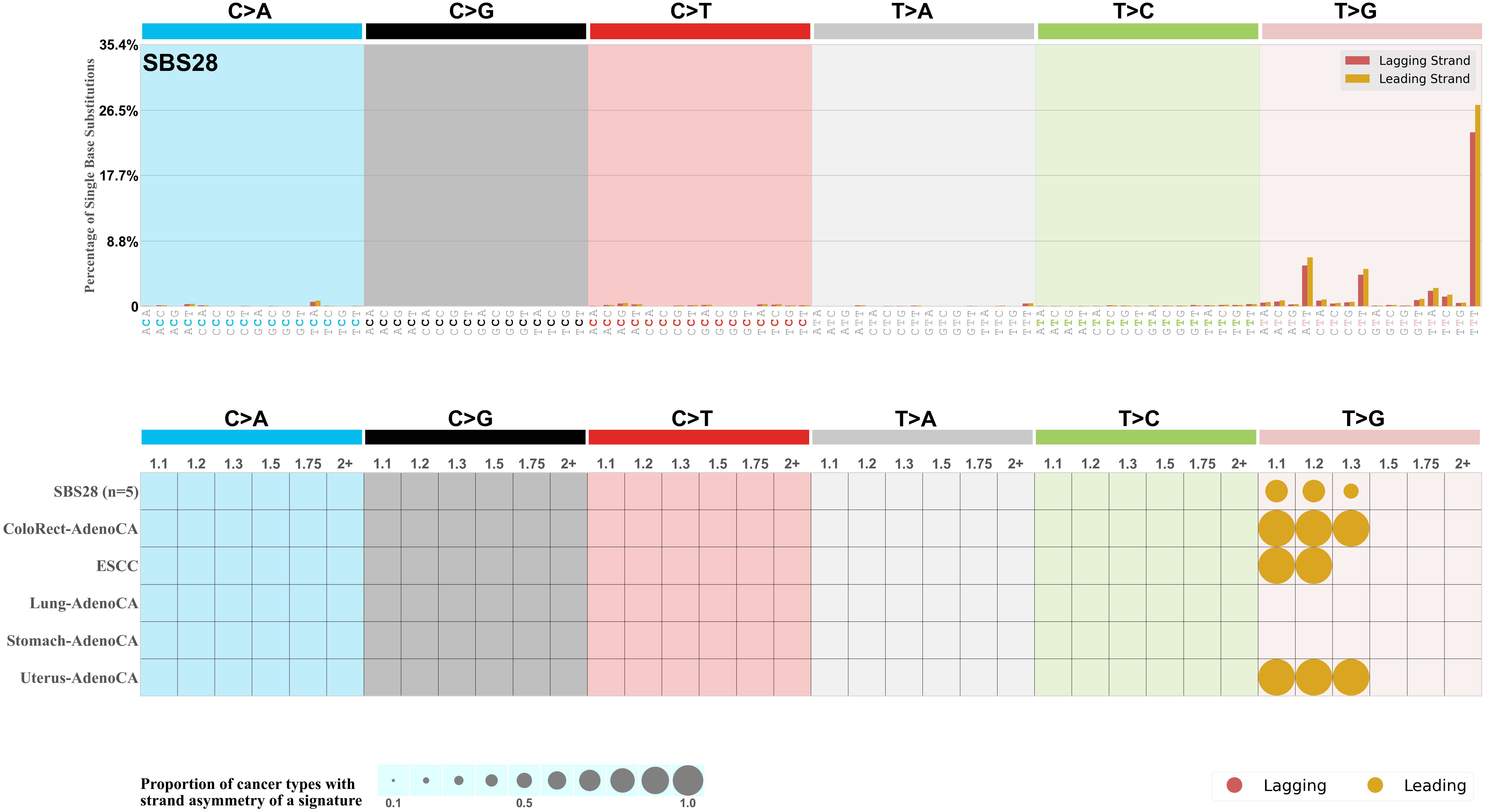 Each mutation attributed to the mutational signature is annotated as either on the lagging strand or the leading strand.