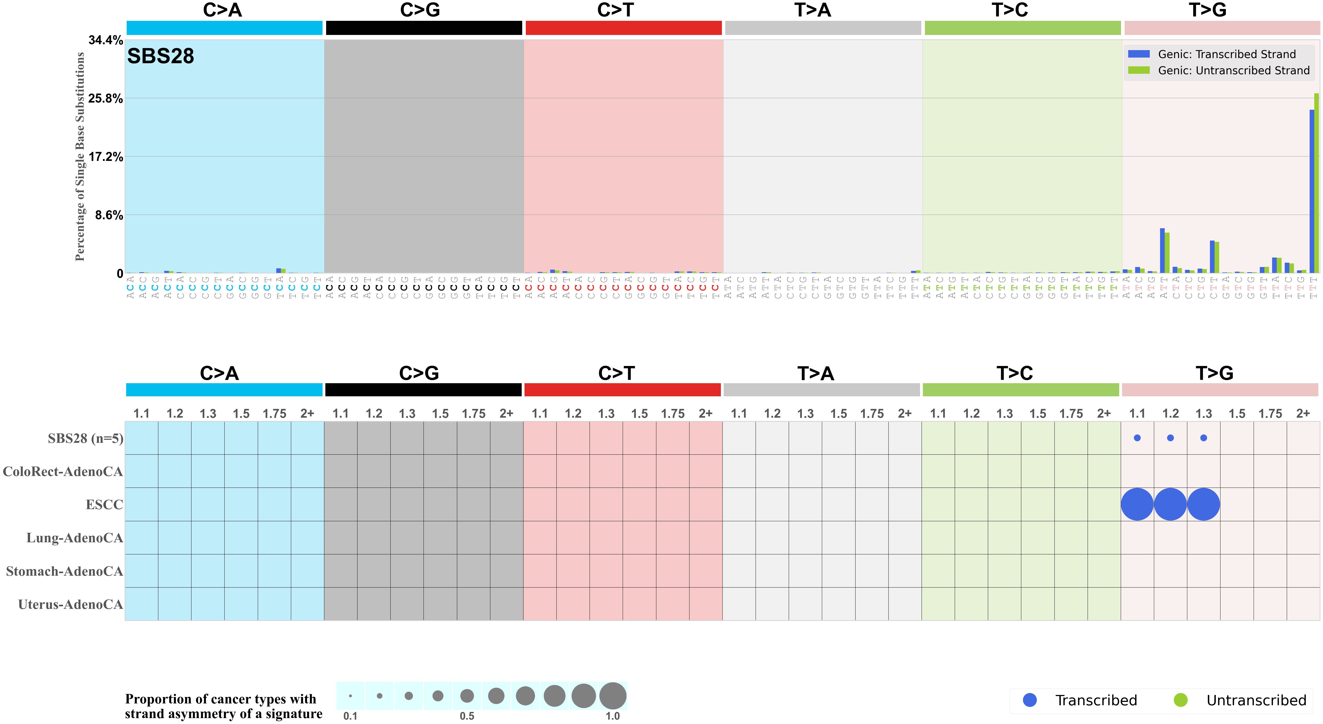 In the lower circle plot, the circles are filled with the colour of the significant strand when there is an odds ratio of at least 1.1 with statistical significance. The first row of this plot displays the transcriptional strand asymmetry across all cancer types, while the remaining rows present transcriptional strand asymmetry for each cancer type.