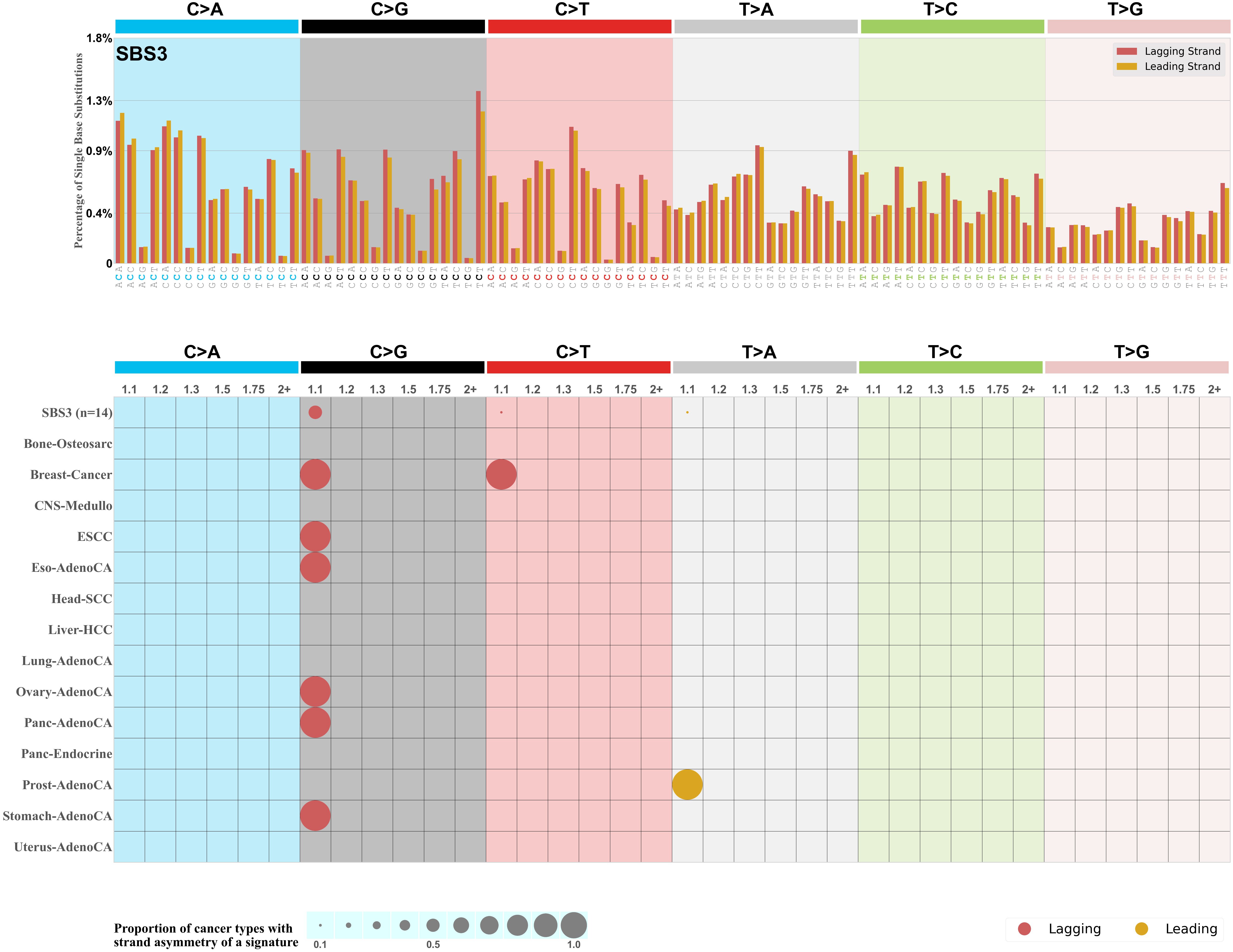 Each mutation attributed to the mutational signature is annotated as either on the lagging strand or the leading strand.