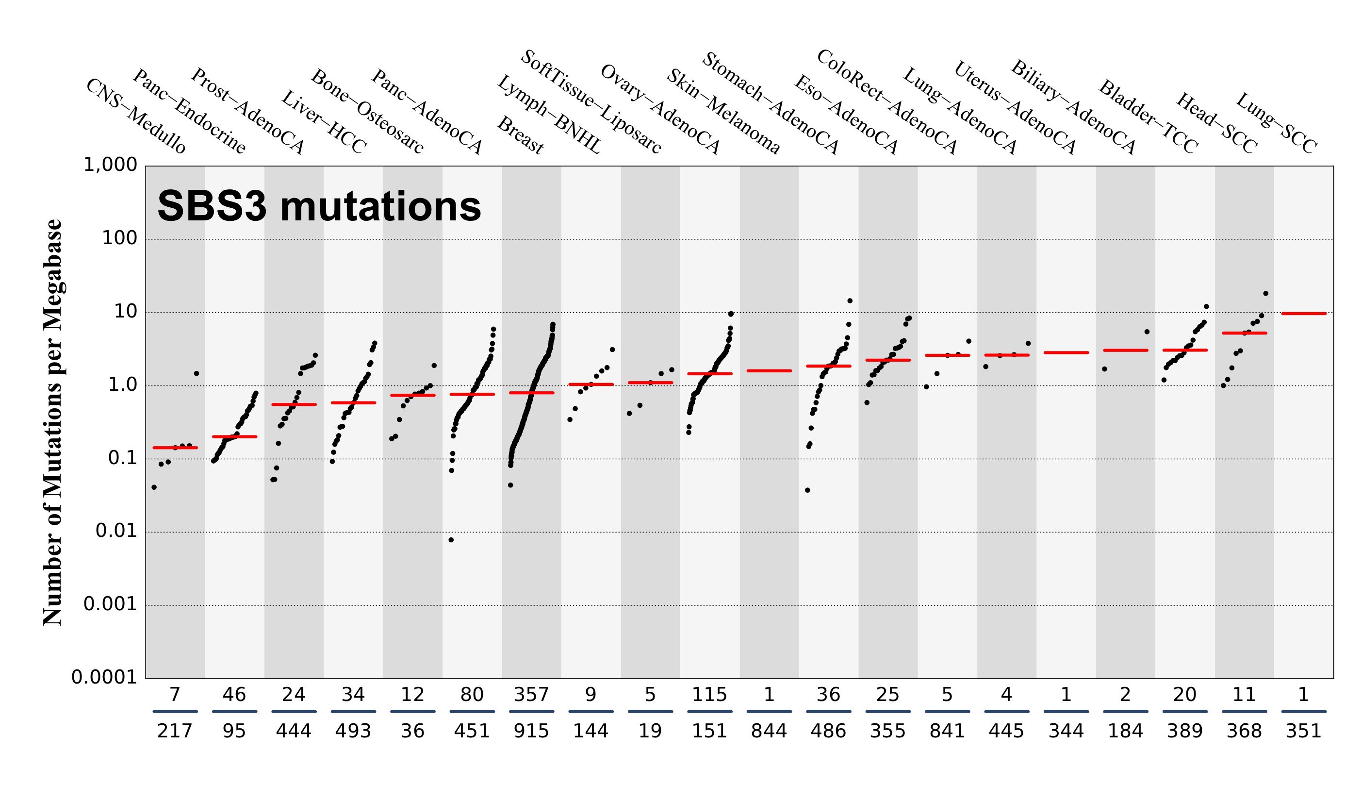 SBS3 is strongly associated with germline and somatic BRCA1 and BRCA2 mutations and BRCA1 promoter methylation in breast, pancreatic, and ovarian cancers. In pancreatic cancer, responders to platinum therapy usually exhibit SBS3 mutations. Together with associated indel and rearrangement signatures, SBS3 has been proposed as a predictor of defective homologous recombination-based repair and thus of response to therapies exploiting this repair defect.